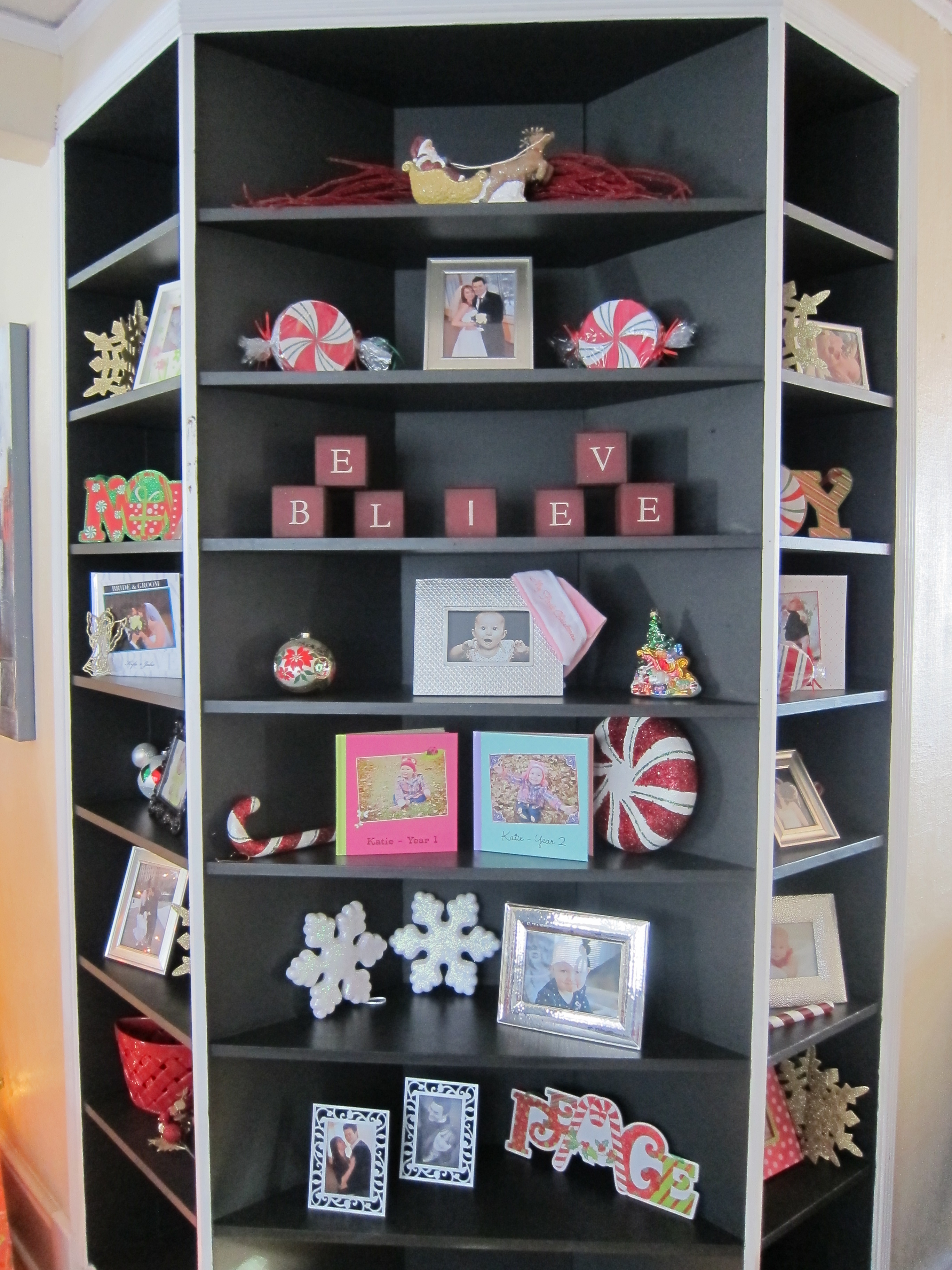 This year we painted our built-in bookshelf a dark gray color. It makes all the decorations pop, which I love. You should have seen the color before (sea green). The shelf is mixed with Christmas decor and pictures of our girls and my husband and I.