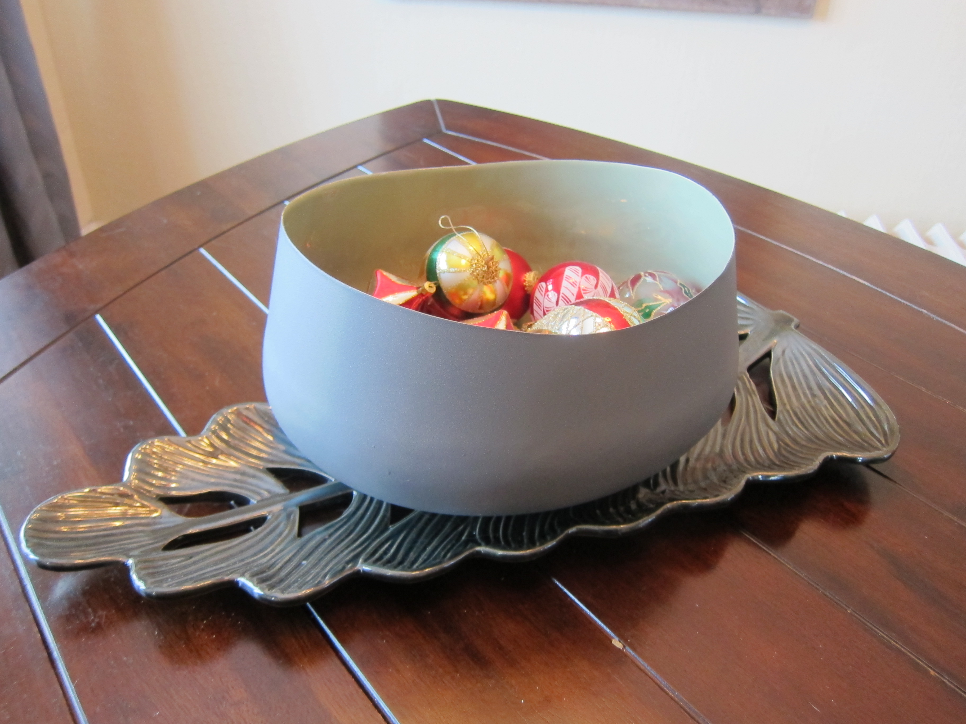 Since I couldn’t put our delicate ornaments on the Christmas tree, I displayed them elsewhere. I placed them in bowls and on shelves.