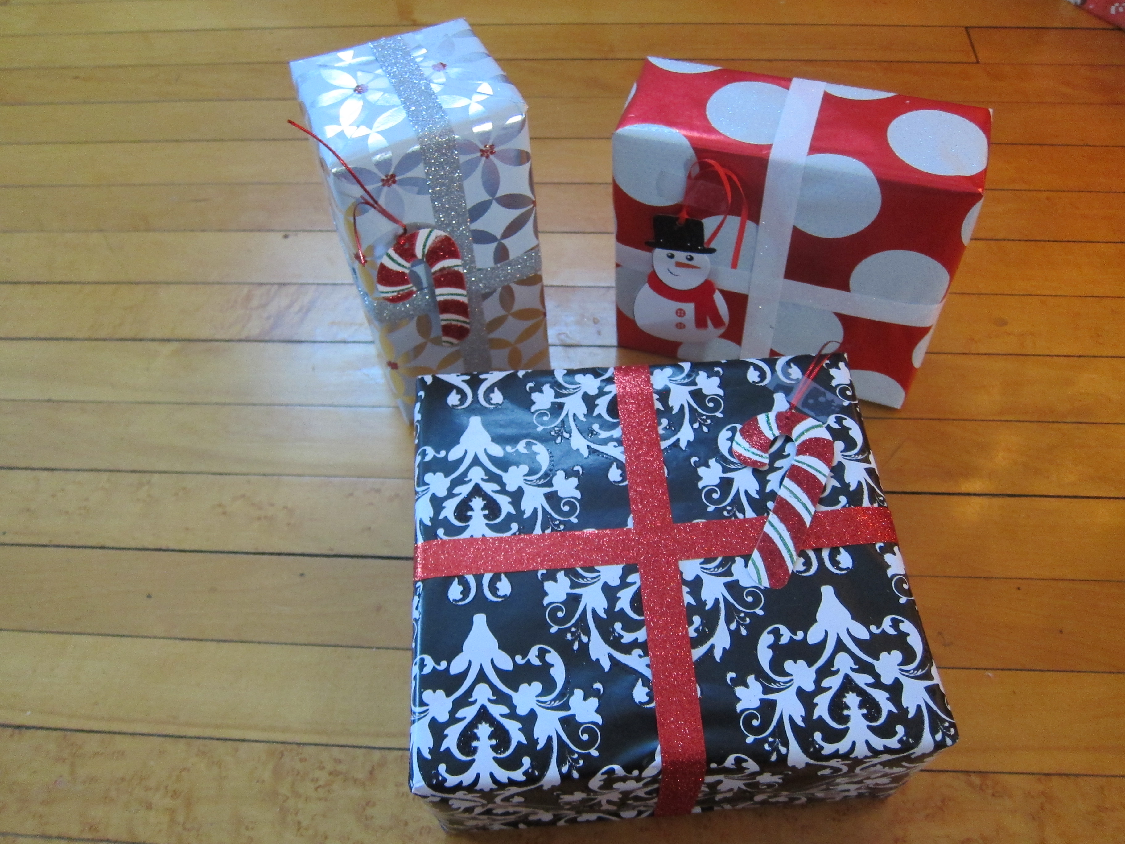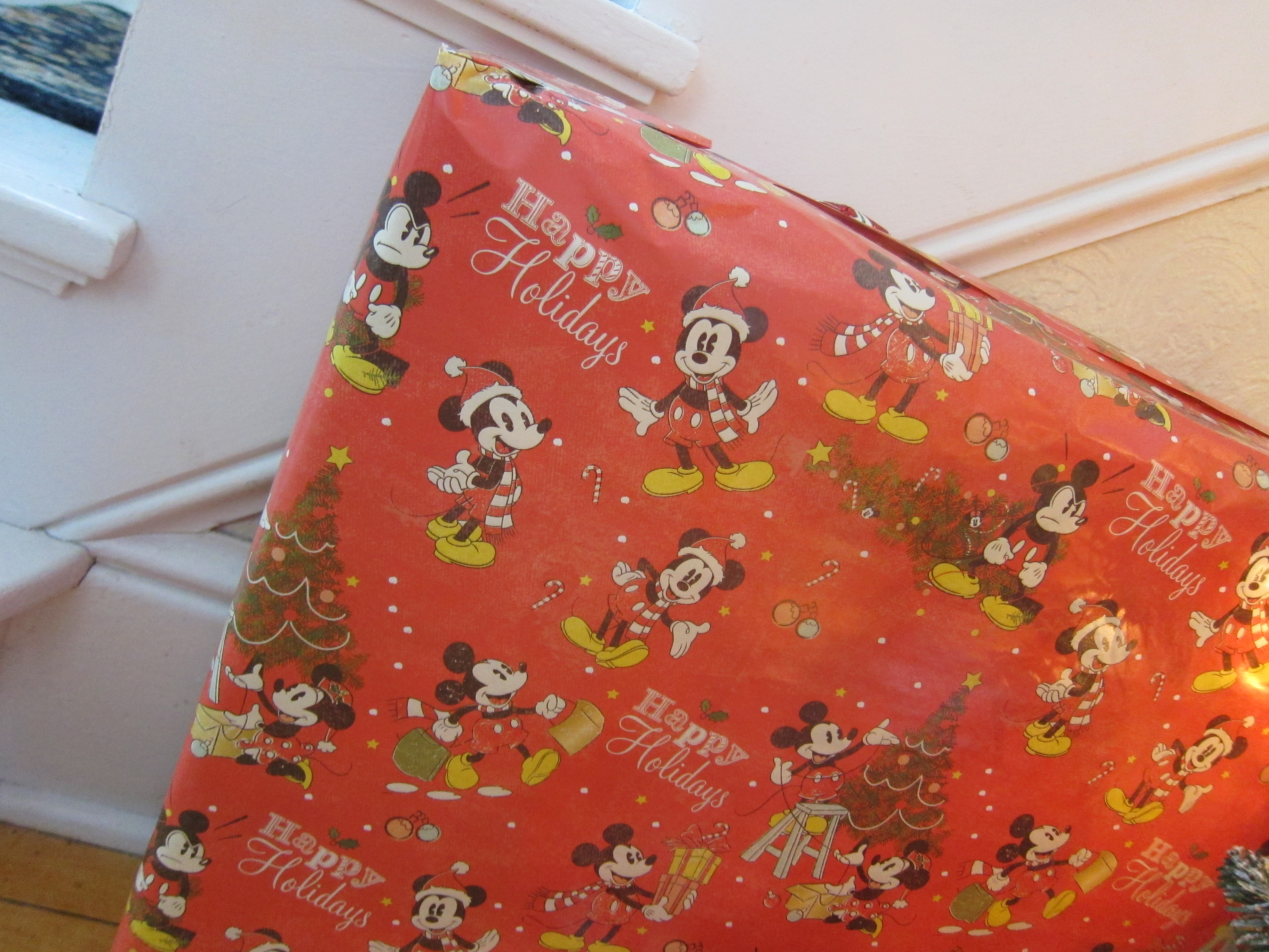I found several rolls of wrapping paper, glittered ribbon, and candy cane and snowman tags at Target. I love how the black, red, and white wrapping paper looks with the red, white, and silver ribbon. We bought a vintage Mickey Mouse wrapping paper for the girls. It’s so cute.