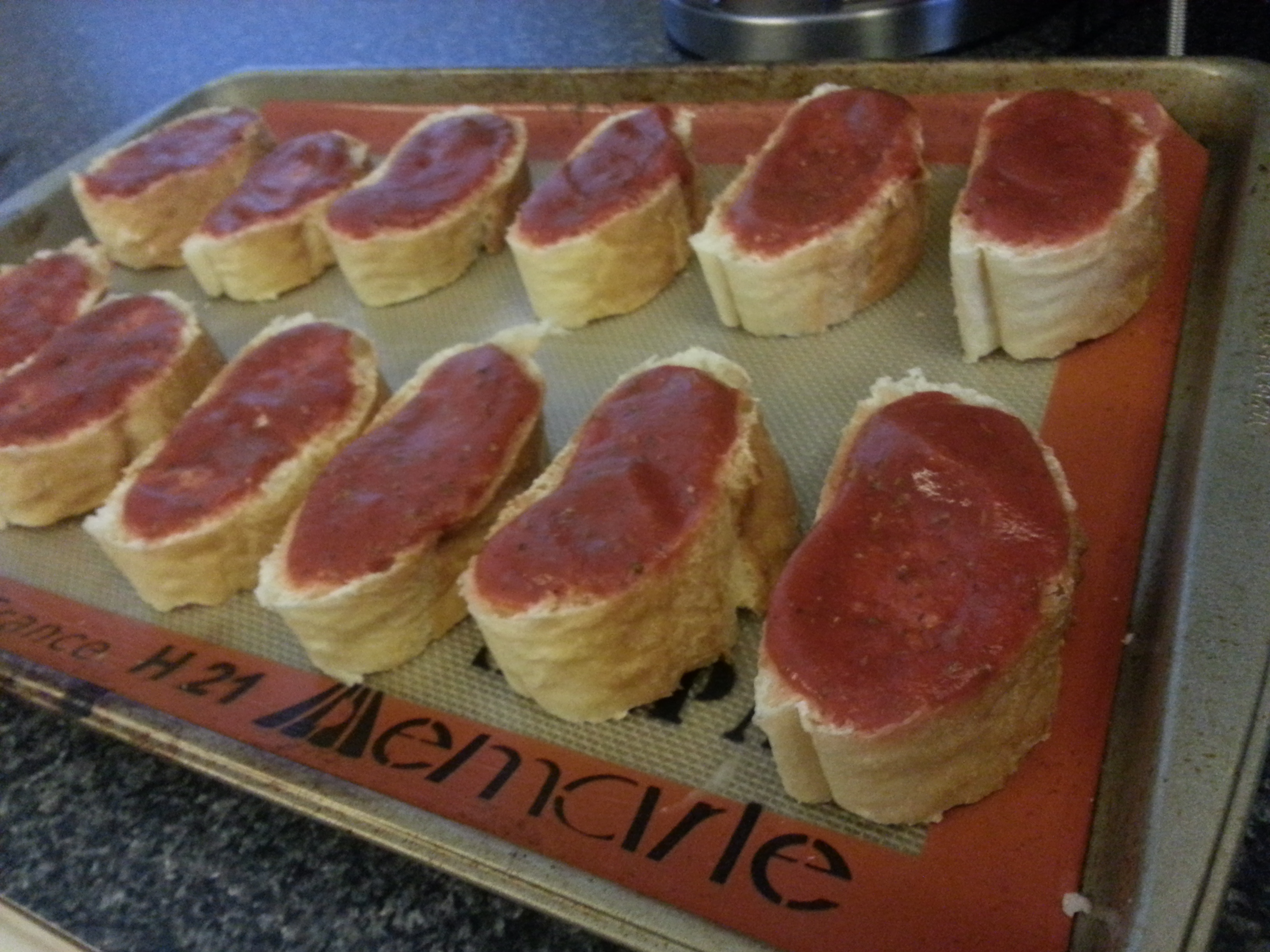 9. Place about 1 tablespoon of tomato sauce on each slice of bread.