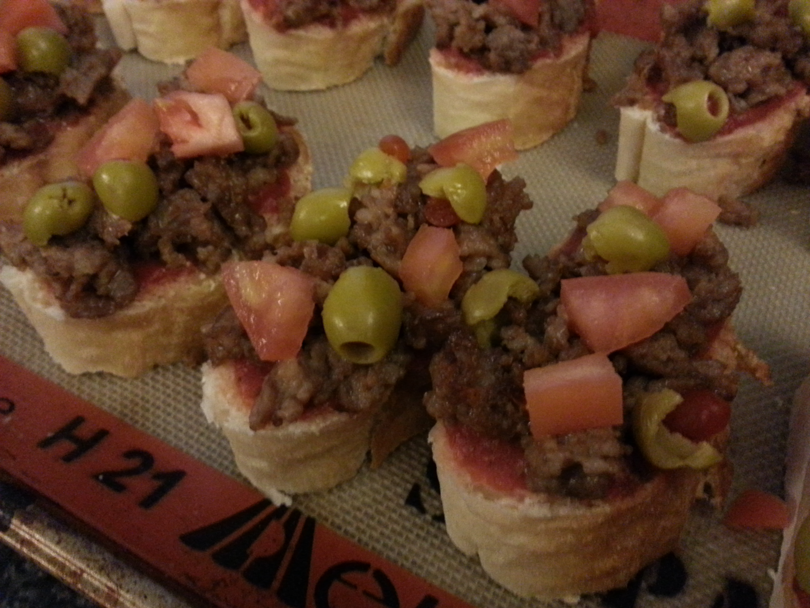 11. Place sausage, 4 pieces of green olives, and 4 pieces of tomato on each slice of bread.