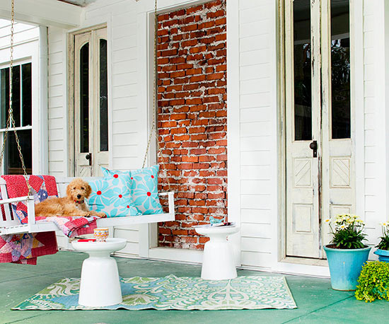 2. Make the porch inviting. Add a few arranged flowers on your porch to make an inviting focal point. If you have plenty of space on your porch, add a bench or chairs with pillows and an area rug.