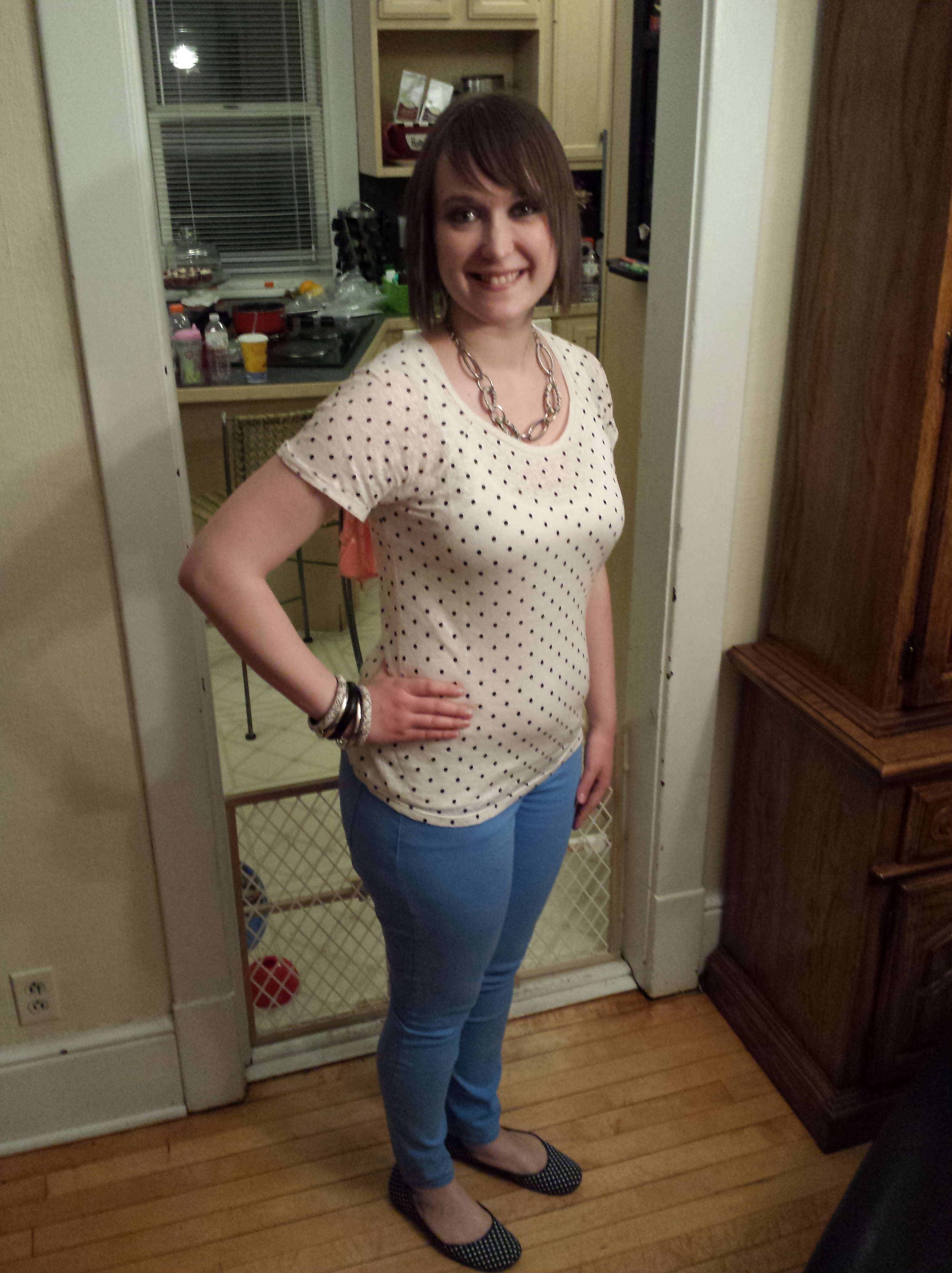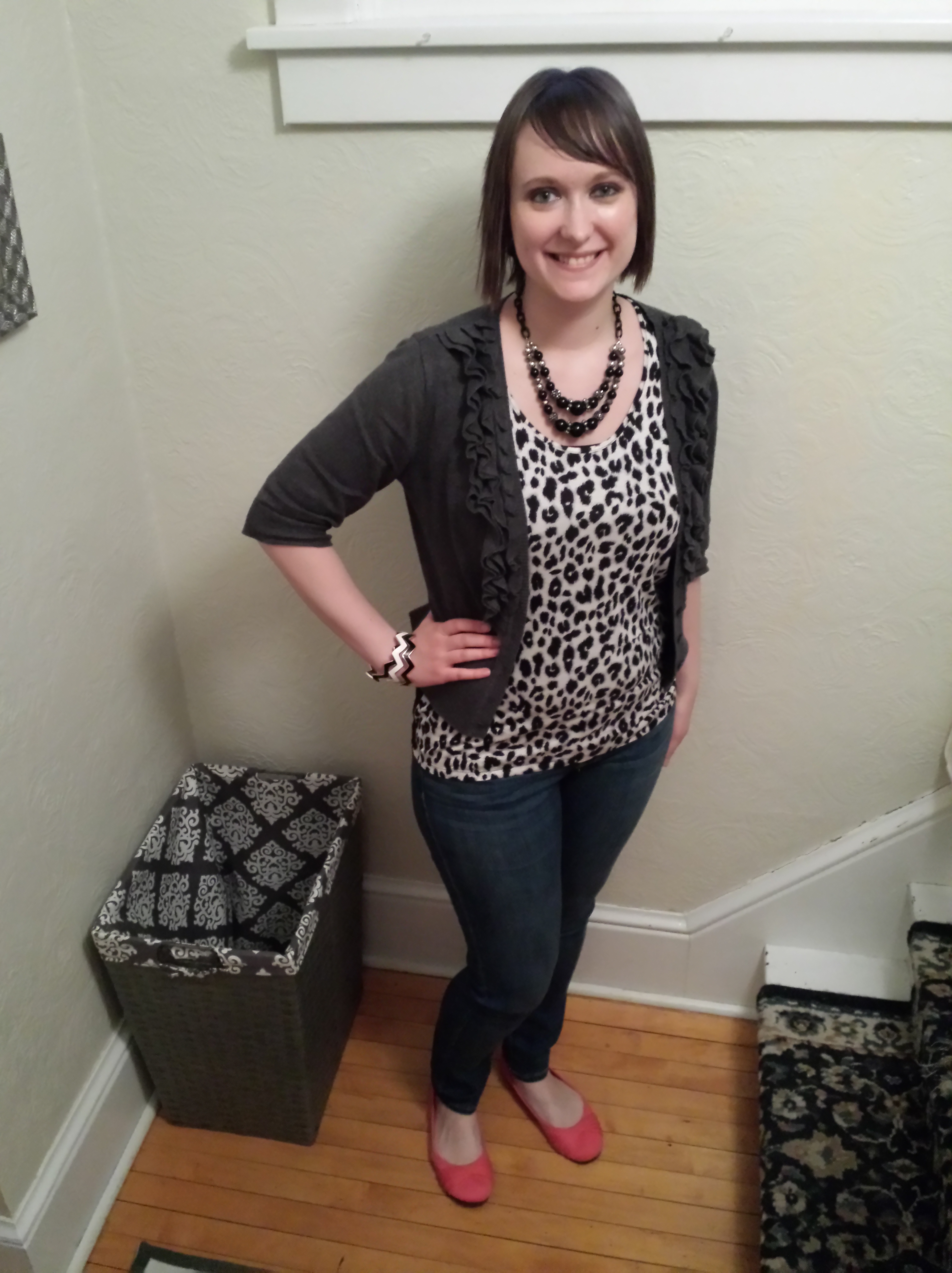 Forever 21 top / JC Penney cardigan / JC Penney skinny jeans / Payless flats / Koo Koo’s Nest jewelry