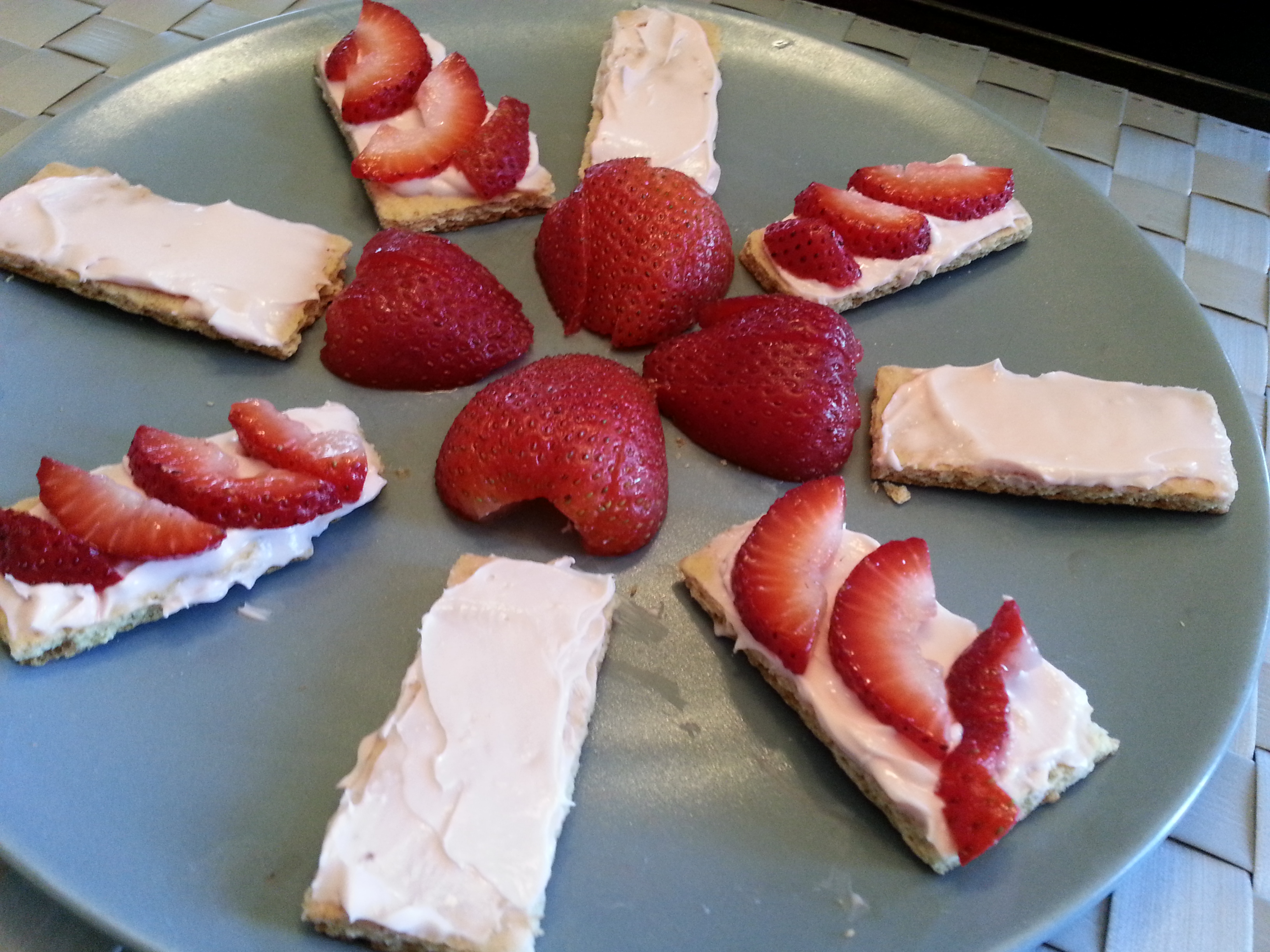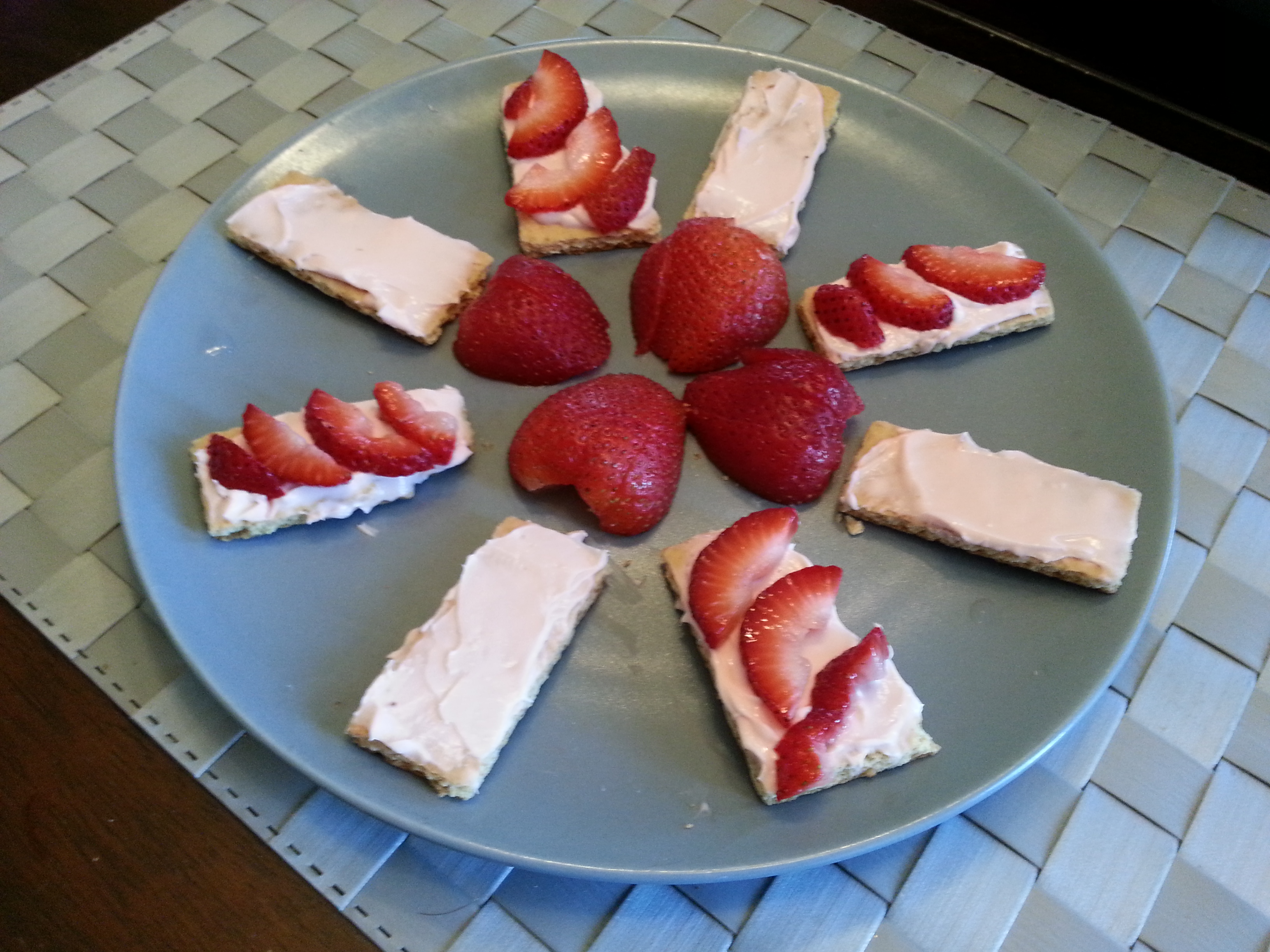 I came up with this idea with strawberries and graham crackers. Katie and Sophia love strawberries. I spread strawberry cream cheese on top of the graham crackers and placed sliced strawberries on top. I cut some strawberries and placed them on the side, so there is still the option of eating them plain. Sophia ate the strawberries plain and Katie loved the crackers with strawberries.