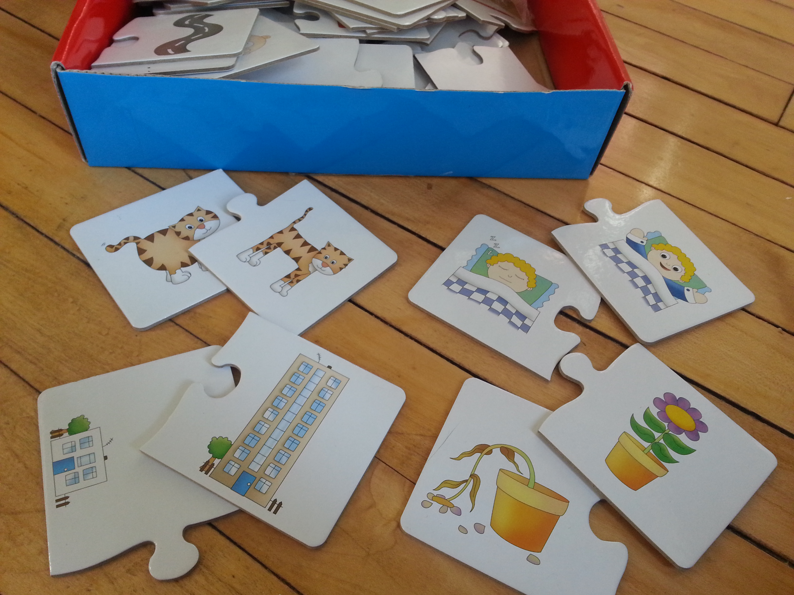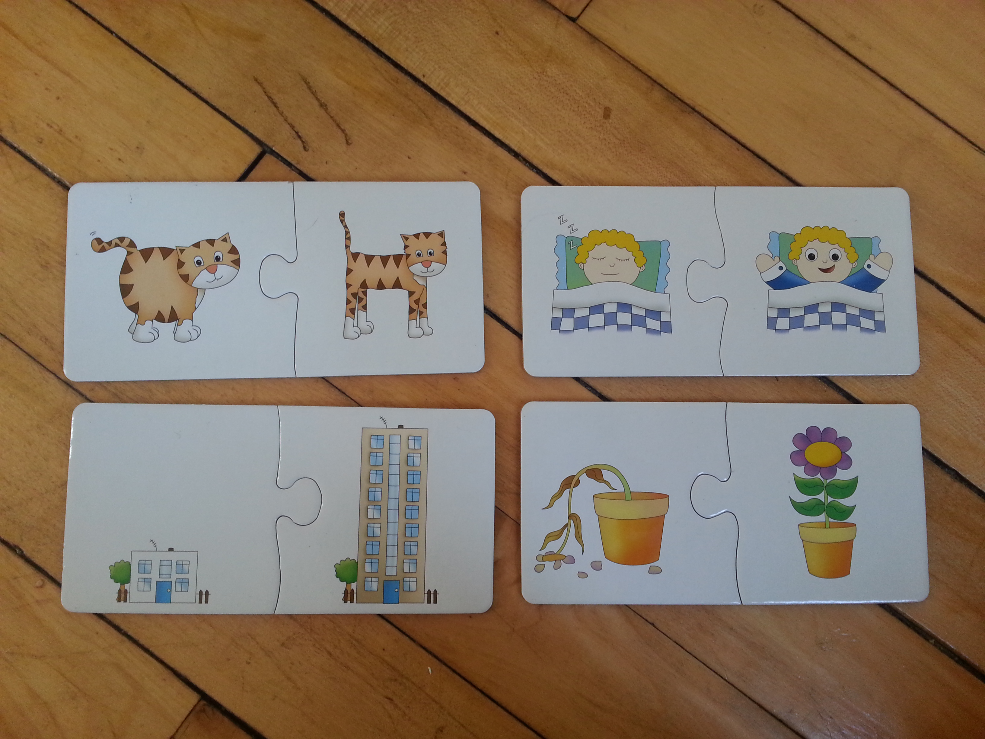 We bought this game for our 2.5 year old daughter, Katie, at Christmas. When Katie played this game, she was couple months past 2 years old. At that time, she wanted to stack the puzzles more than make matches. Fast forward to today (5 months later), Katie will match the opposites mostly by herself. There are several of the sets that I’ll have to help her.