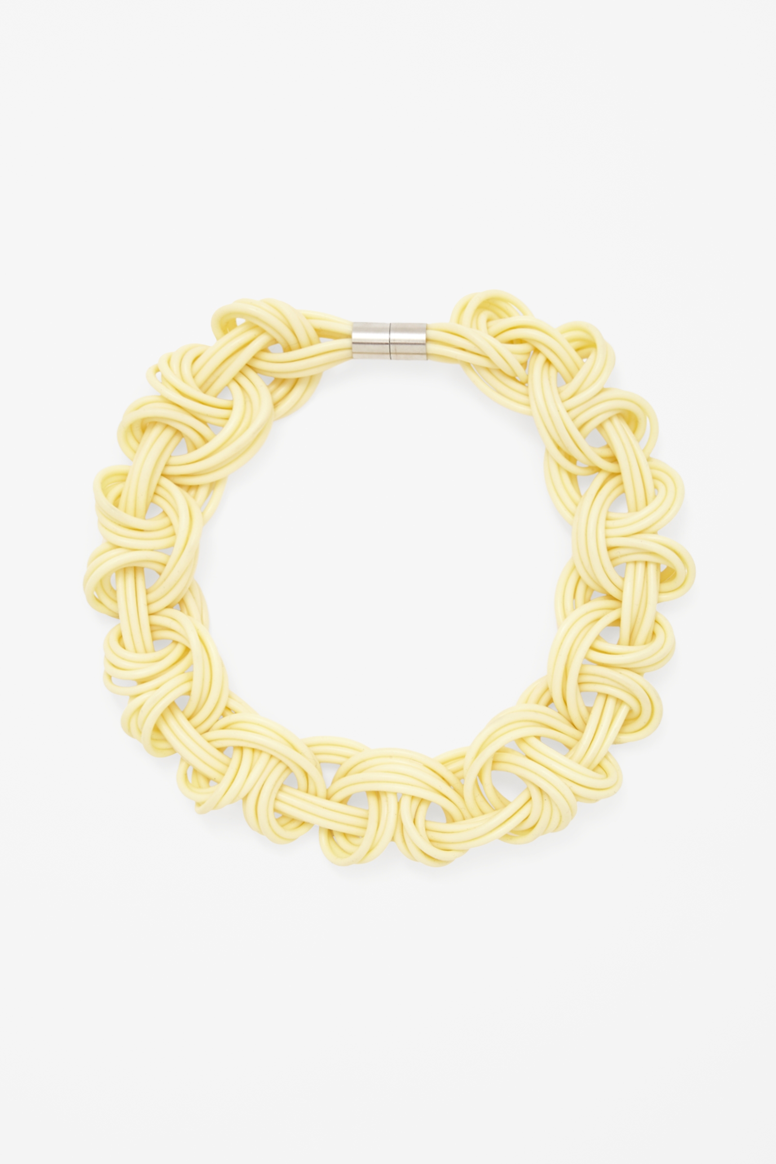 These necklaces would definitely be a big statement when worn. I don’t actually have any yellow in my closet or jewelry, but I could see myself wearing this yellow necklace. I really love the braided look of the necklace.