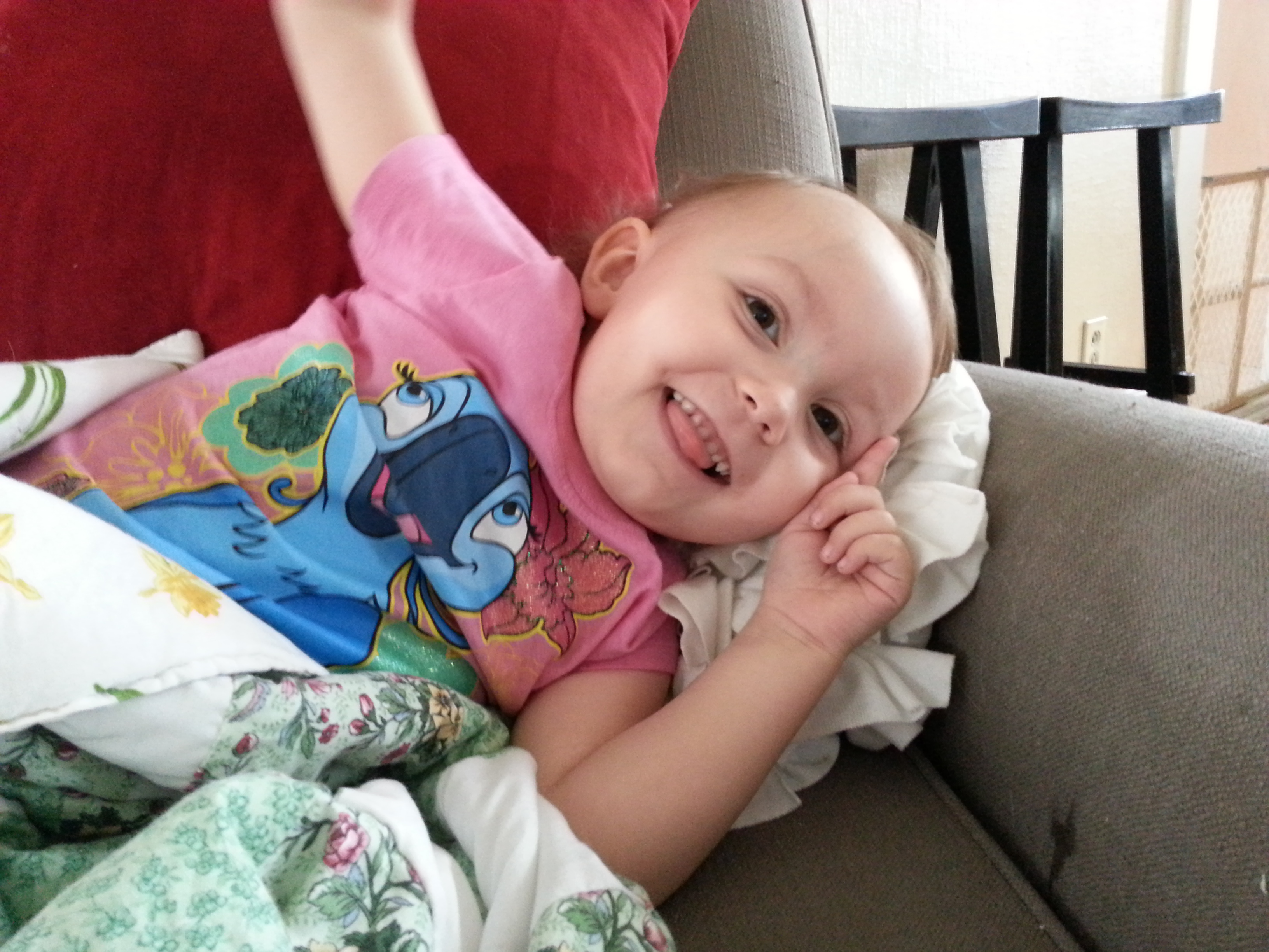 Below are pictures of my girls while they were watching Frozen. Katie was being silly while I was taking her picture (As you can see, Katie is wearing a shirt from one of her favorite movies). Sophia had the smile on her face, because little Anna had just asked little Elsa if she wanted to build a snowman.