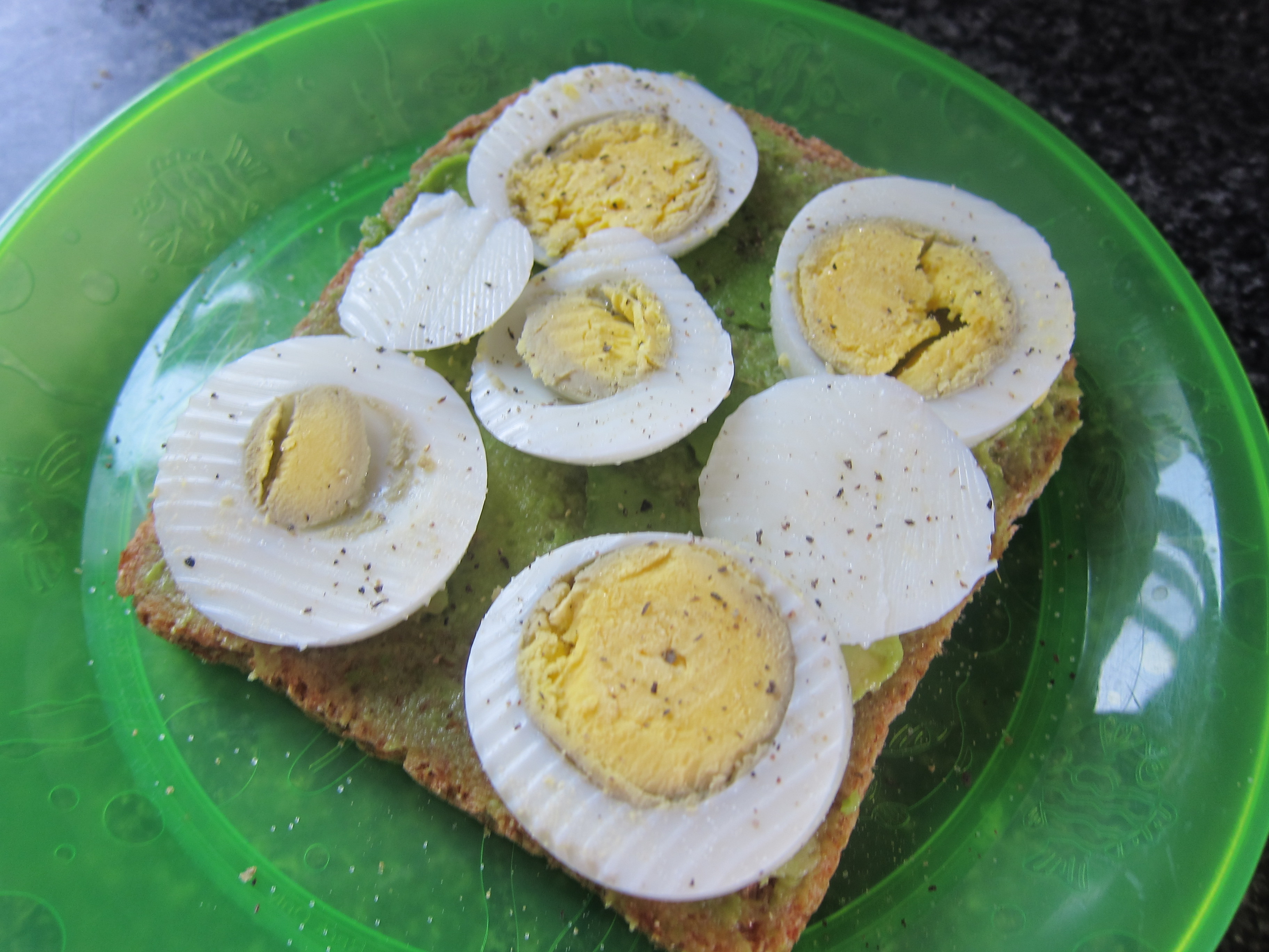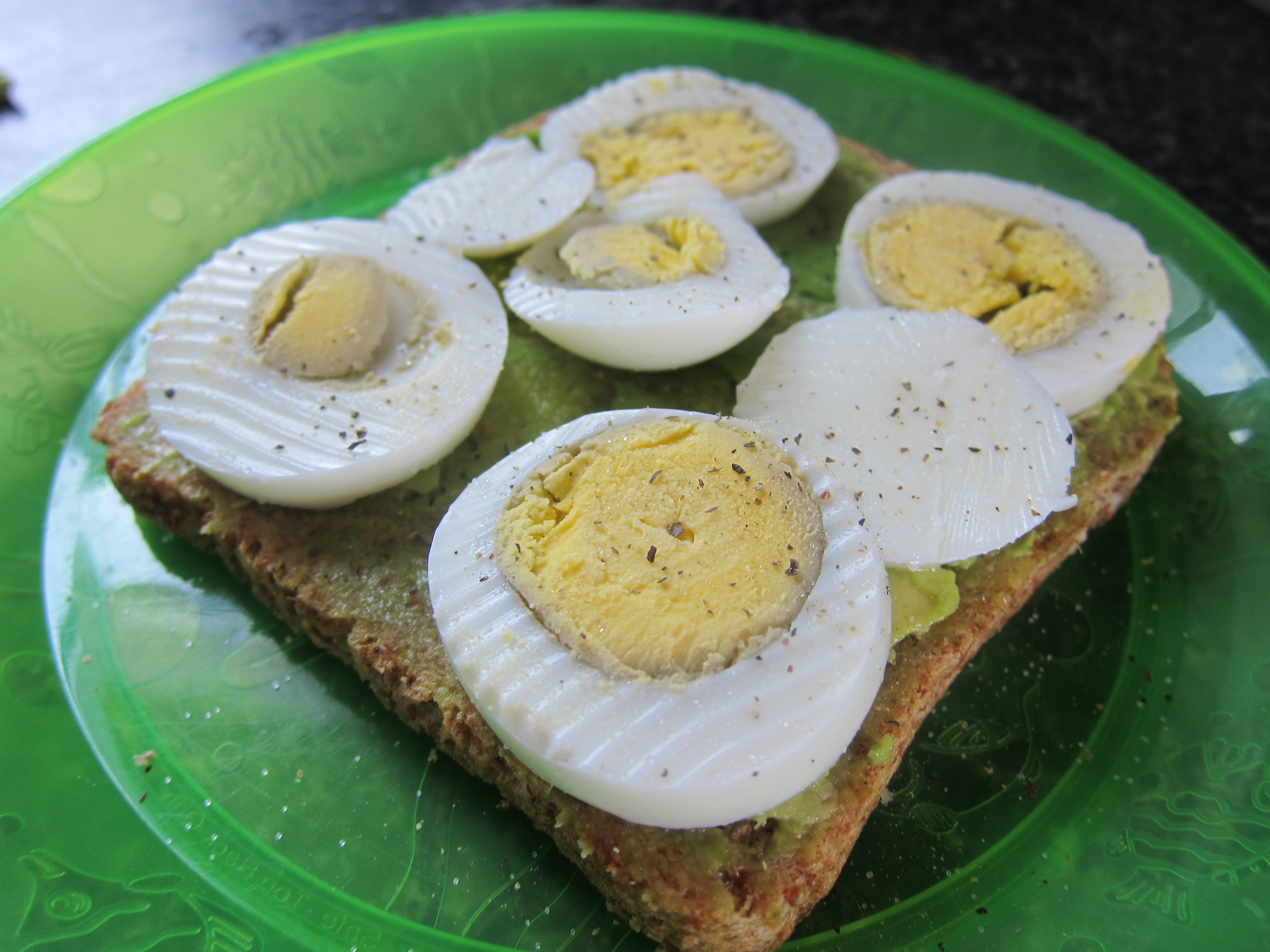 The taste of avocado and eggs is perfect. I love eating over easy eggs with sliced avocados underneath. So I thought, why not add the two on top of a slice of toast? I smashed avocado on top of the toast and added a sliced boiled egg. So good!