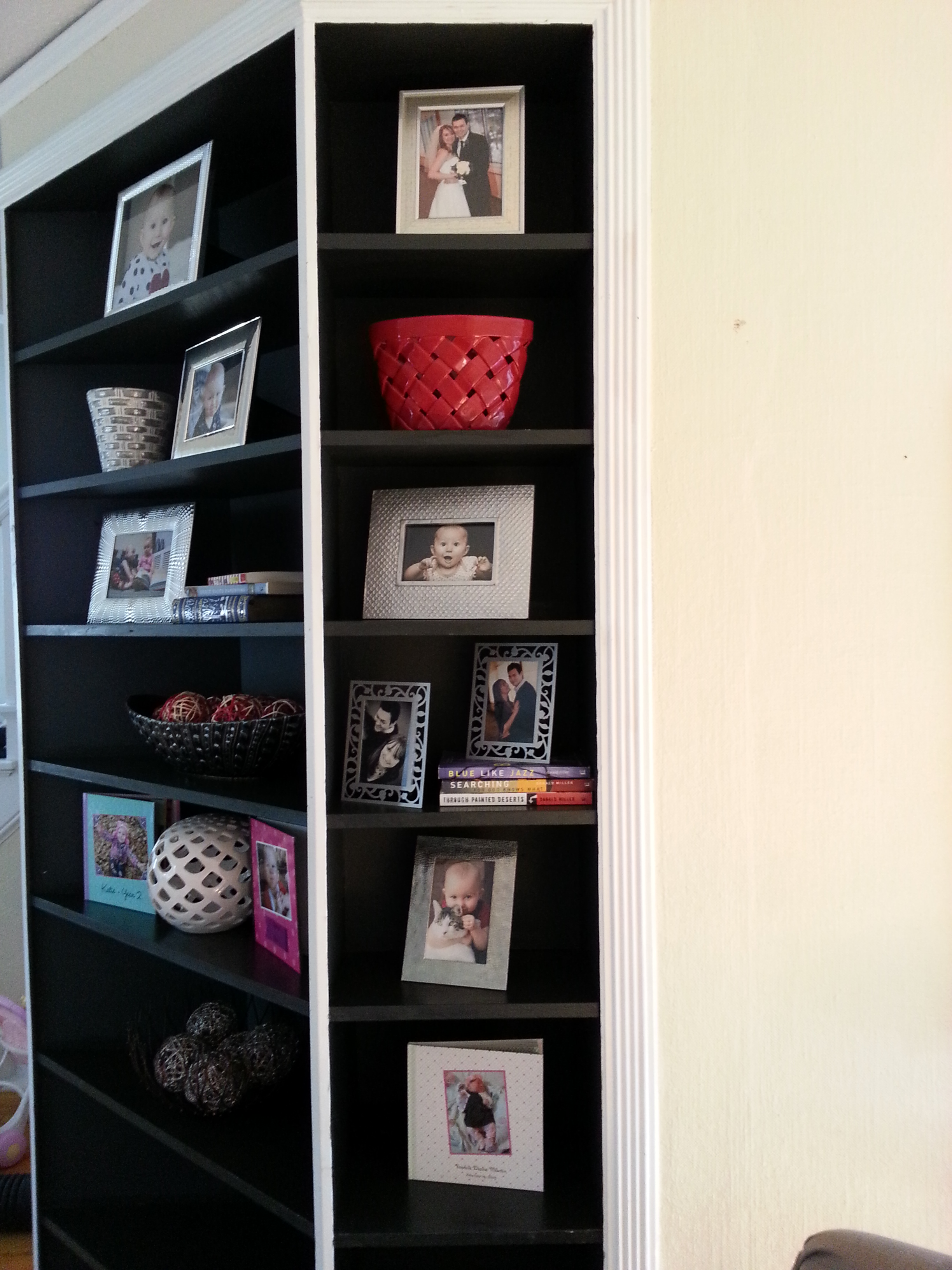 As you can see by the view of the whole built-in bookshelf, the bottom two shelves are empty. Since I have a toddler running around the house (Sophia loves to get into things), the shelves are empty on purpose.
