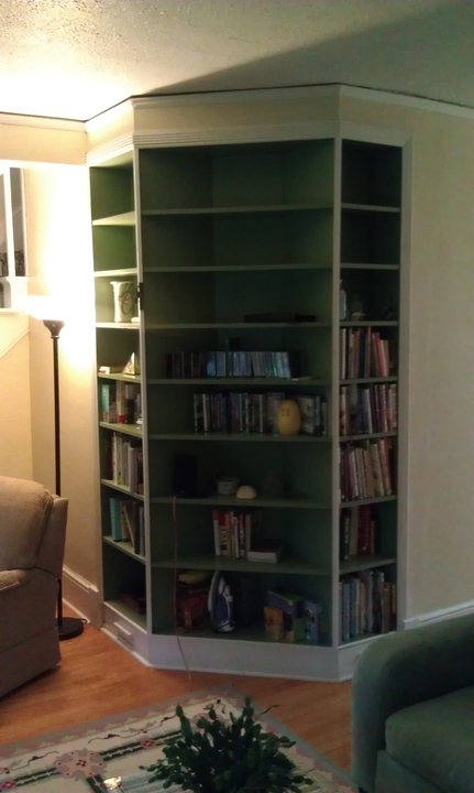 When we bought our house several years ago, the built-in bookshelf in our living room was a ‘very pretty’ color. I wasn’t a big fan of the sea green on the shelf. What do you think?  We took the picture below during a walk through of the house before we officially bought it. So the decor isn’t mine.