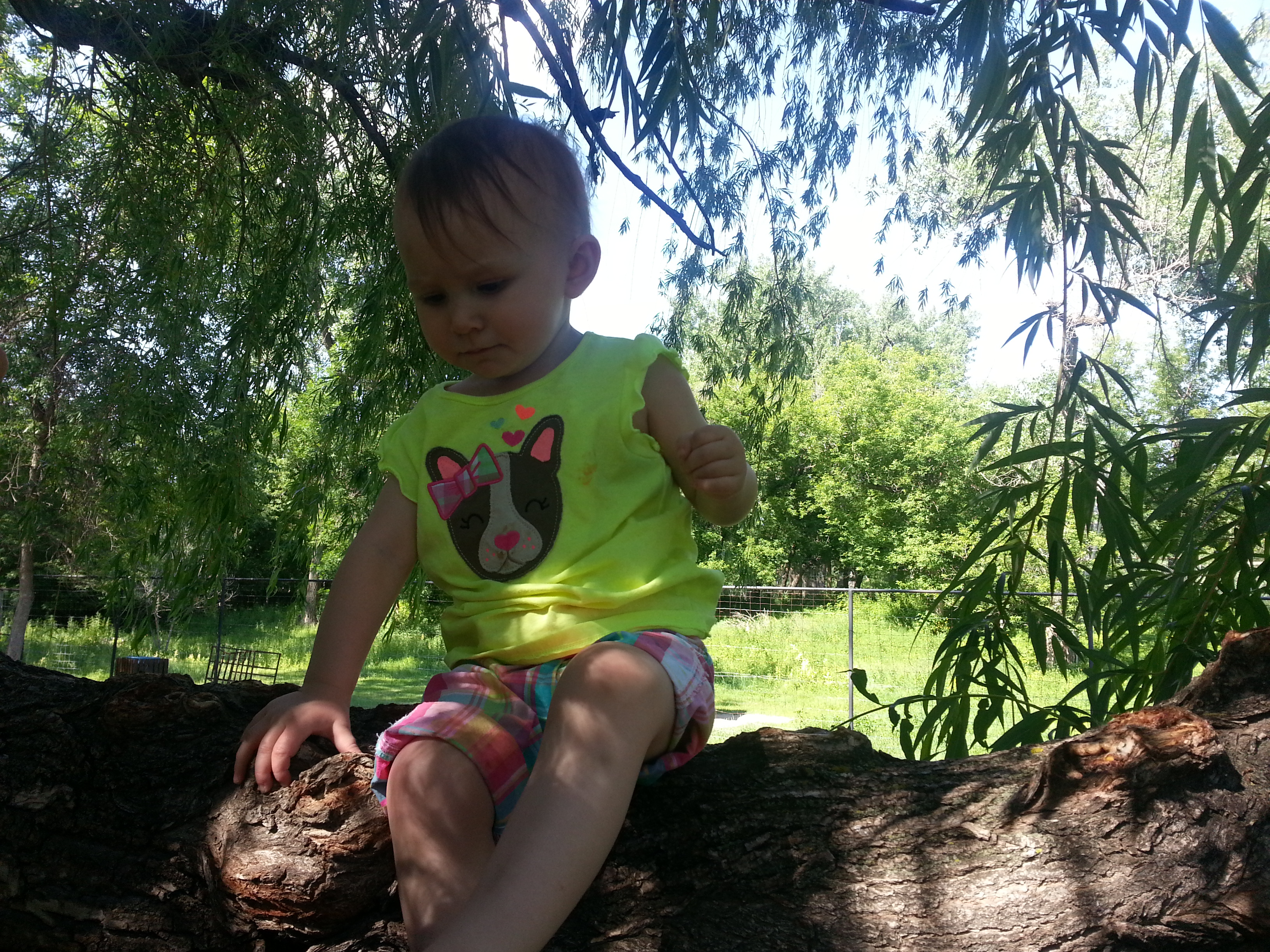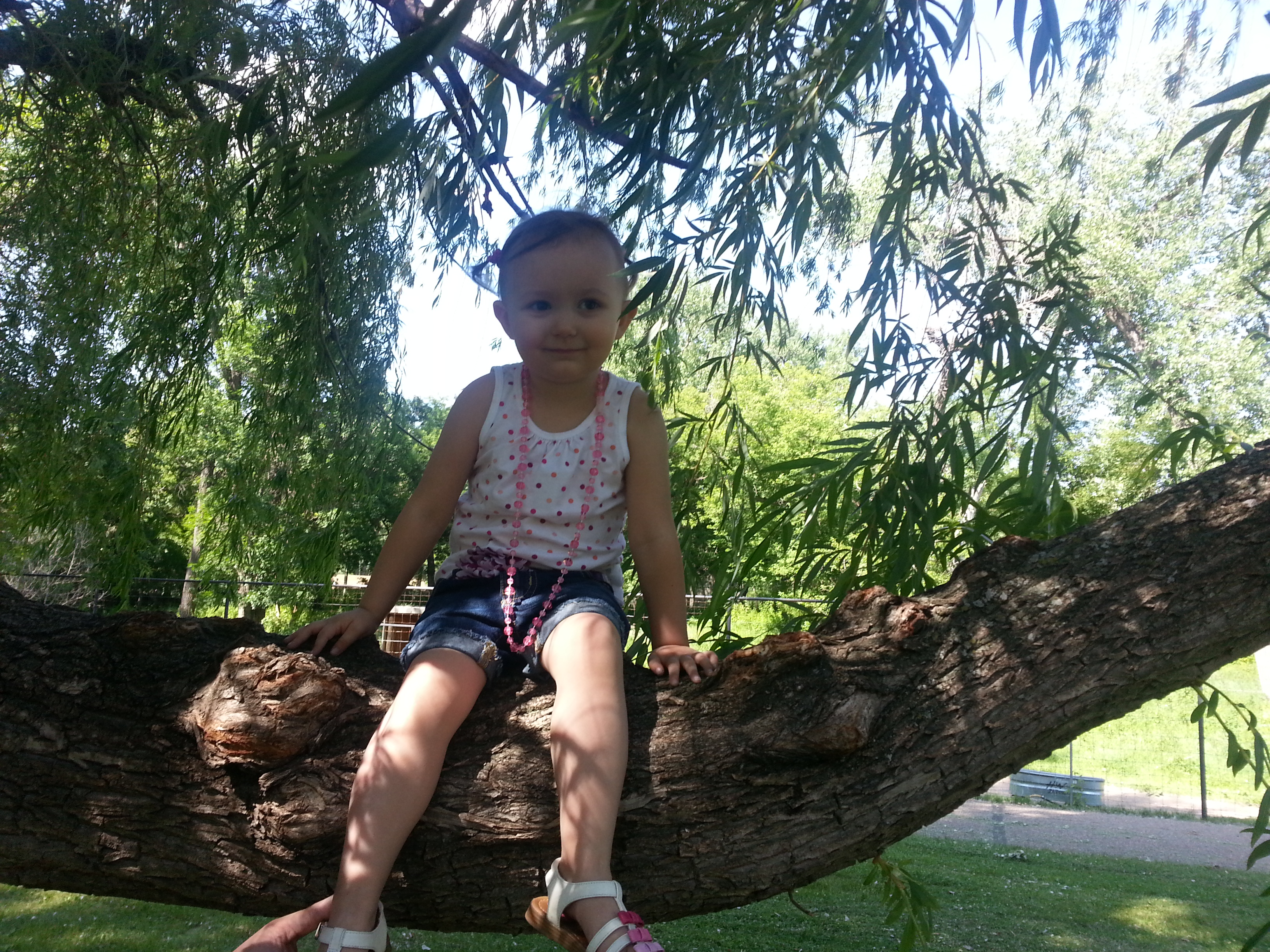 Towards the end of the zoo trip, we found a tree with a lower branch. We put the girls up on the branch to sit. Katie wanted to go back on the tree when we took her down. Sophia wanted to come down from the tree right away.