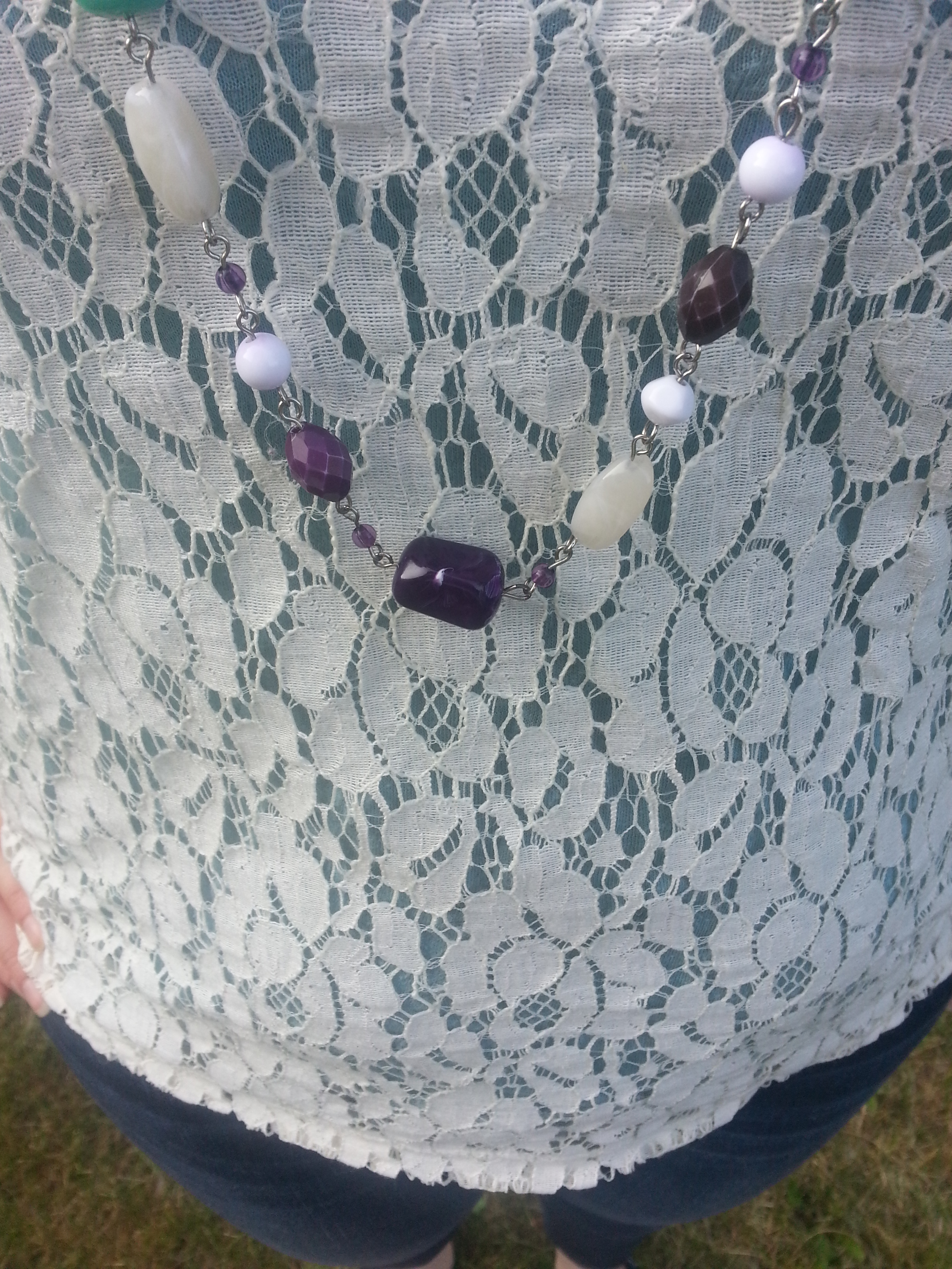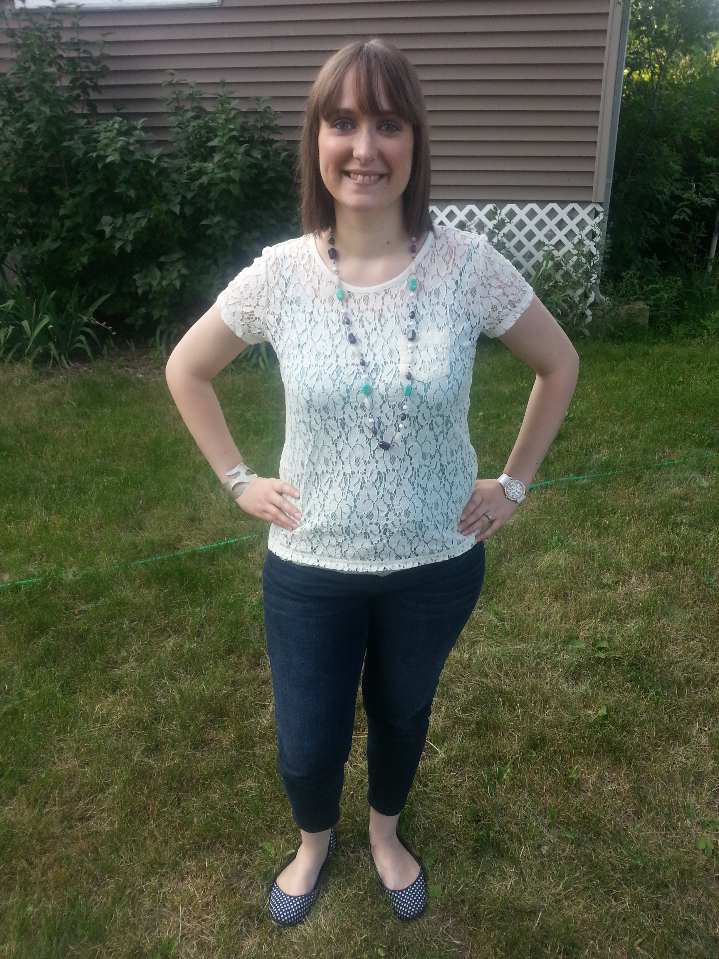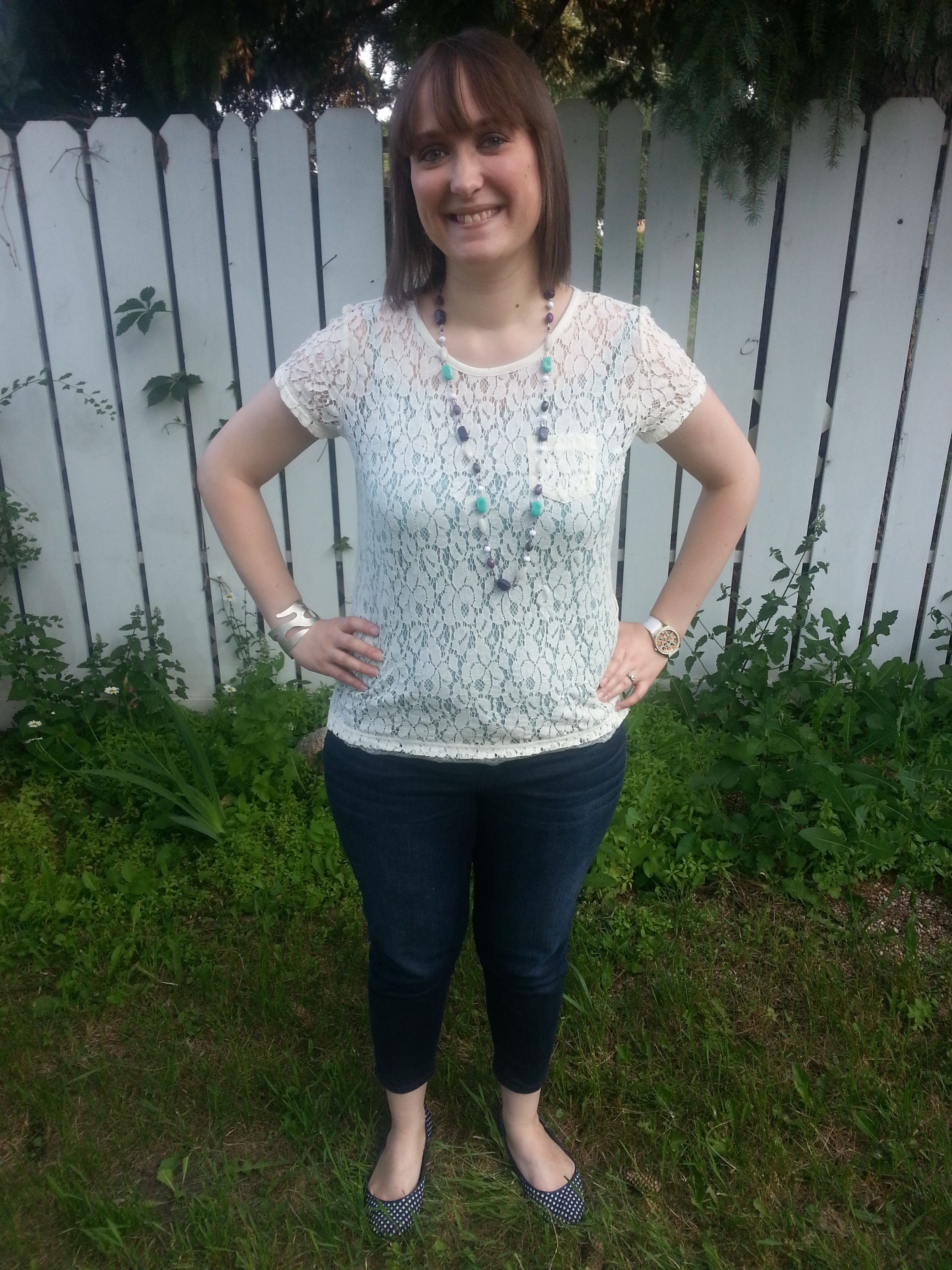 What did I wear with the white lace top? I wore a teal tank top underneath since the top is see through, my skinny ankle jeans (JC Penneys), and my blue polka dotted flats (Marshalls). I wore my purple and teal necklace (Maurices), purple Vera Wang earrings (Kohl’s), bracelet, and watch.