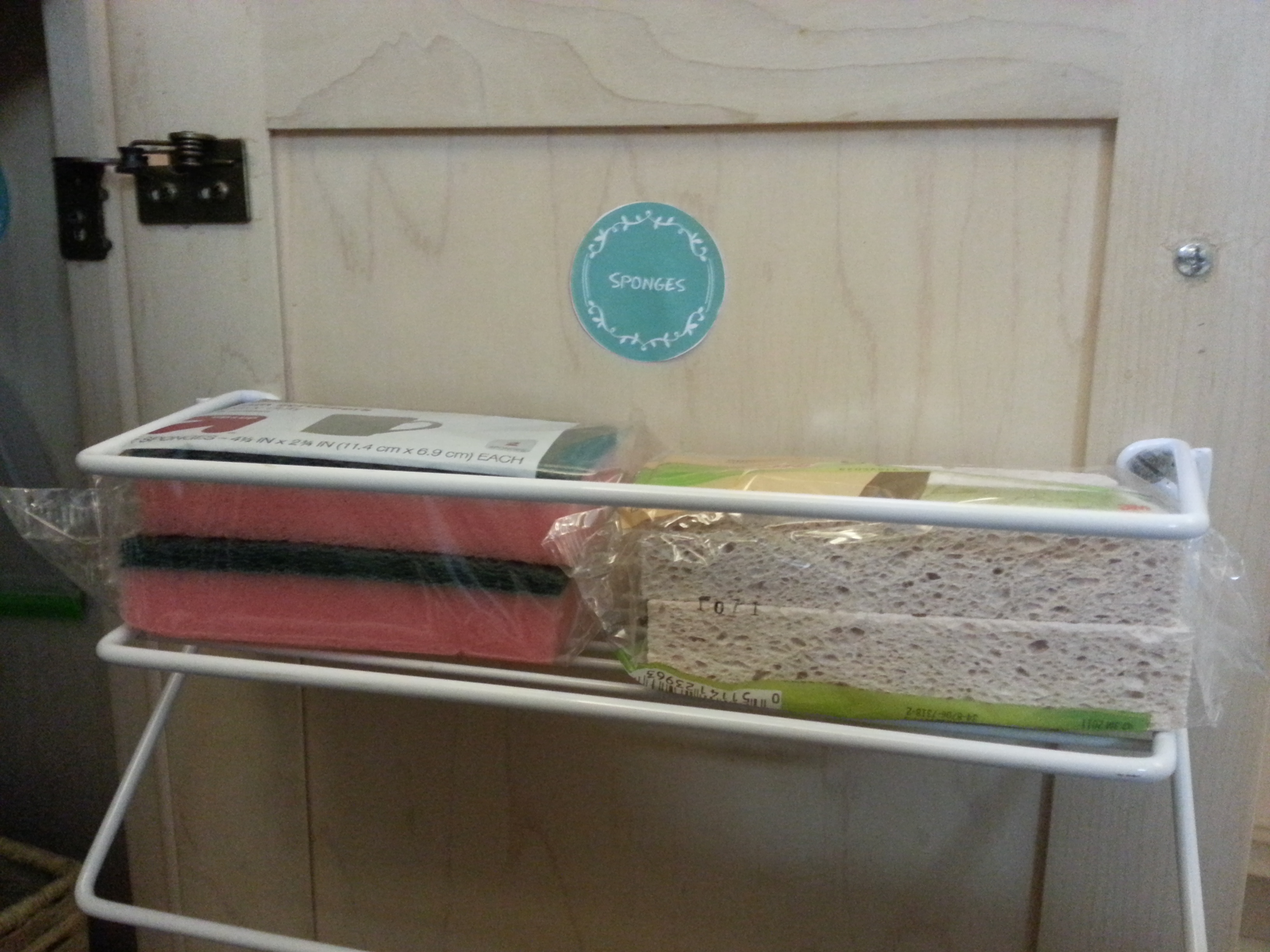 On the left cabinet door, I left the dish soap and dishwasher detergent in the basket. On the right cabinet door, I moved the rags from the basket and placed new sponges in the basket instead.