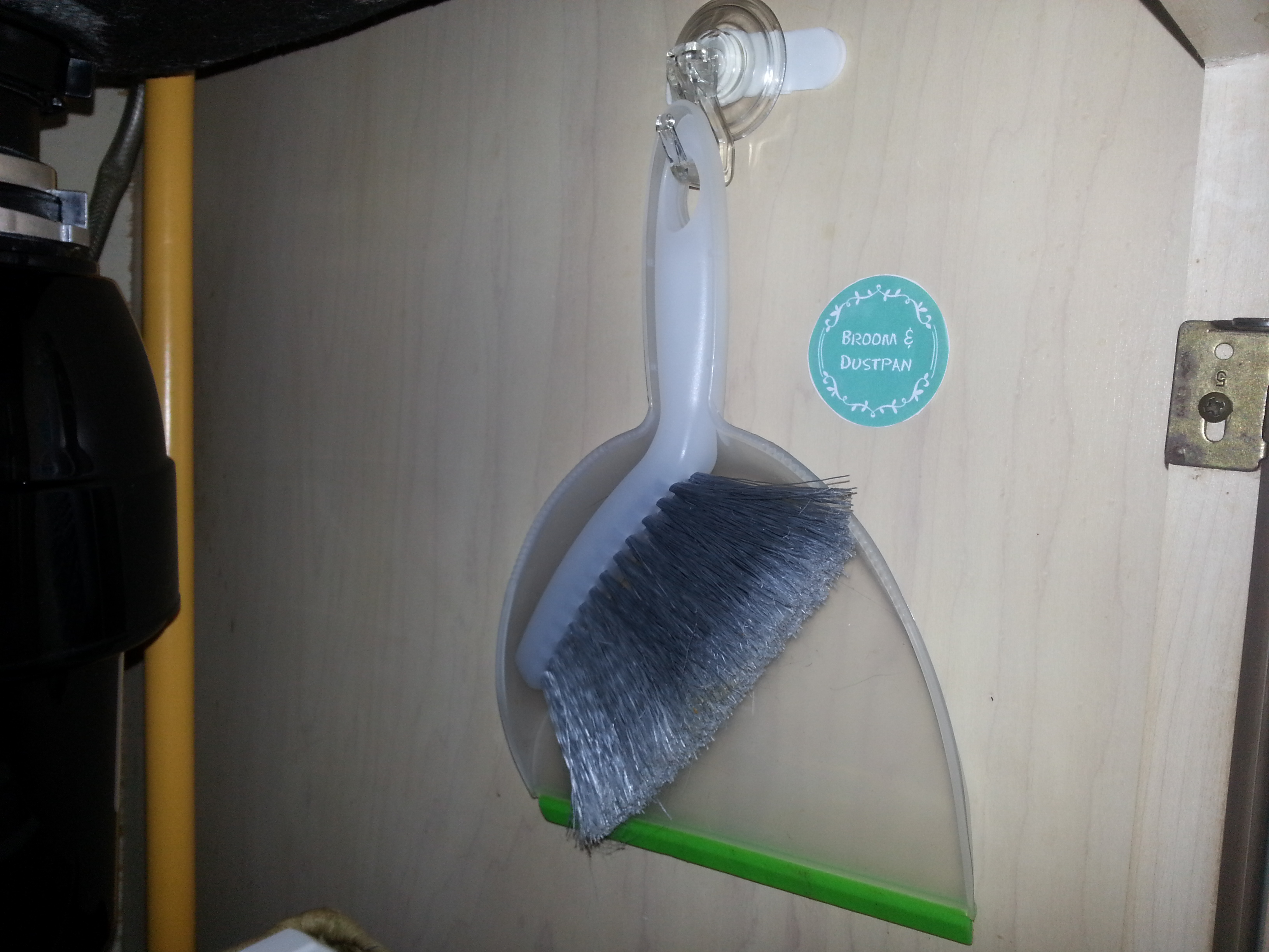 On the left side of the cabinet, I placed couple storage containers and the box of garbage bags. In the first storage container, I stored the rags for cleaning. In the second storage container, I placed the mopping supplies. On the right side of the cabinet, I placed a basket with cleaning supplies. On the right side of the wall in the cabinet, I placed the small broom and dustpan.