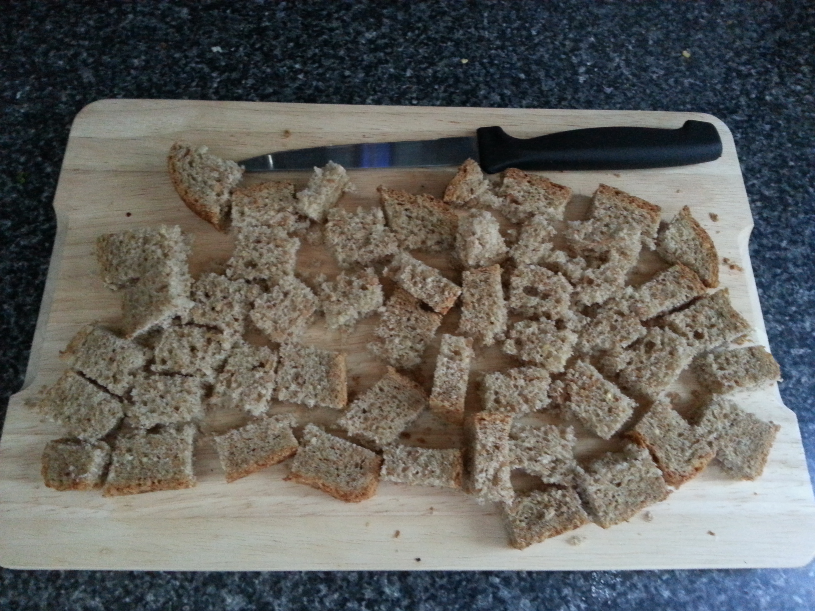 2. Place cubed bread pieces in toast oven for about 10 minutes; set aside to cool.