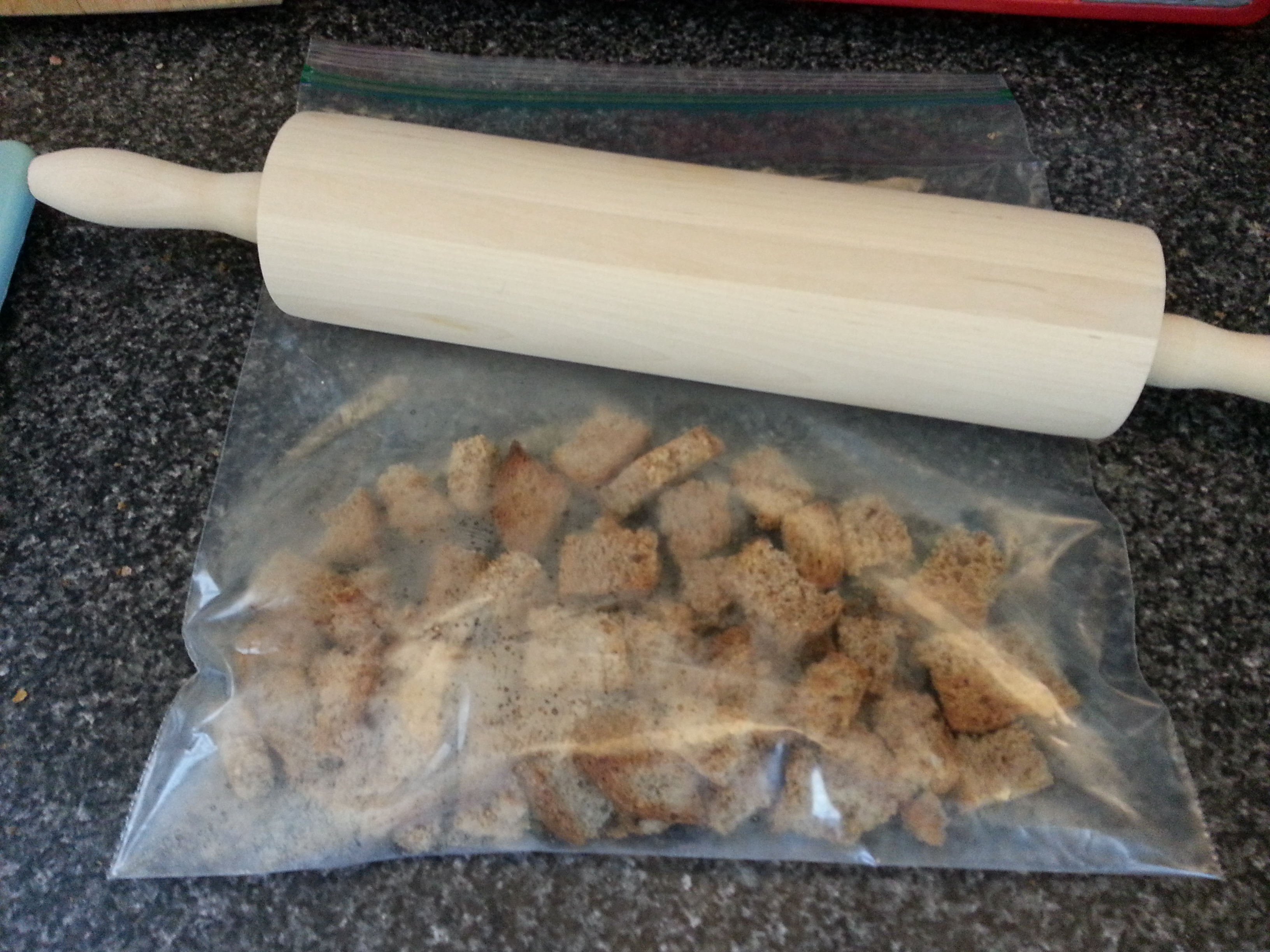 6. Roll bread cubes with rolling pin to crush the bread (It’s okay to still have bigger pieces of bread).