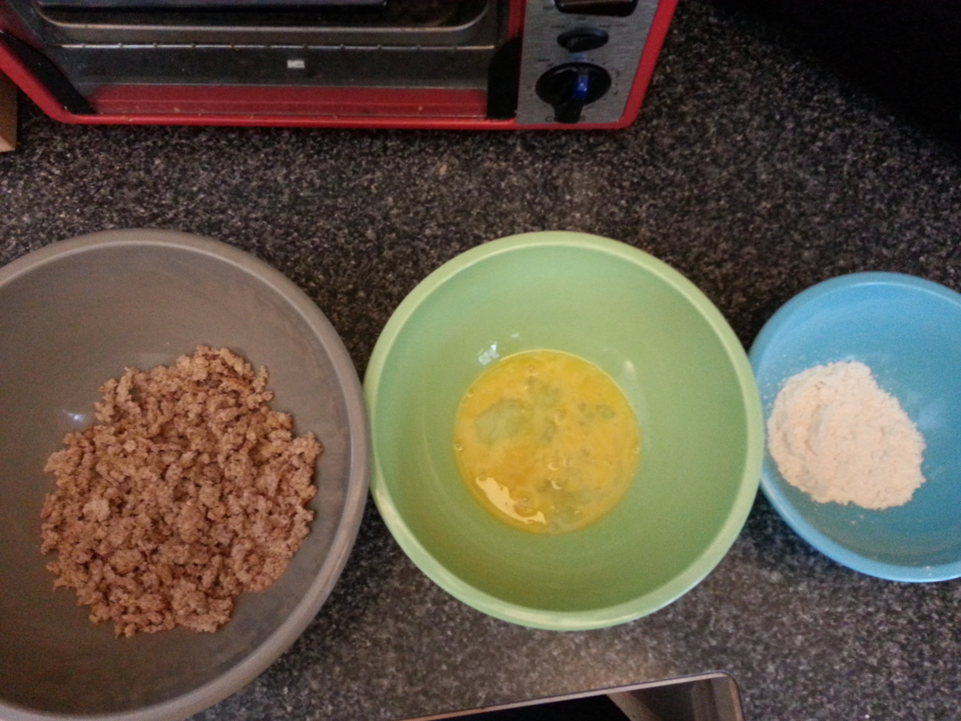 7. Place flour, egg, and bread crumbs into separate mixing bowls.