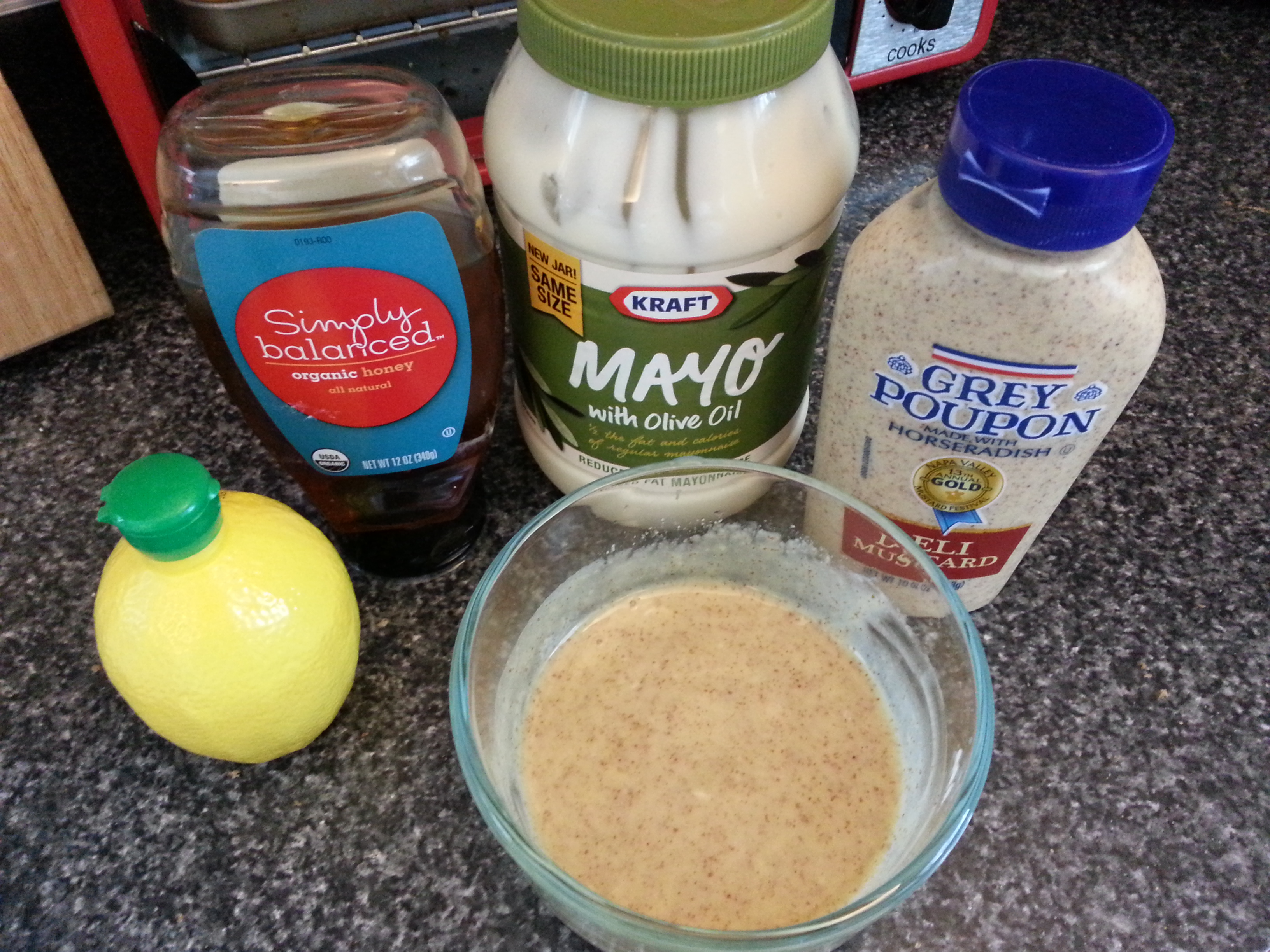 13. Stir together the lemon juice, mustard, honey, and mayo in a small mixing bowl to make a smooth sauce.