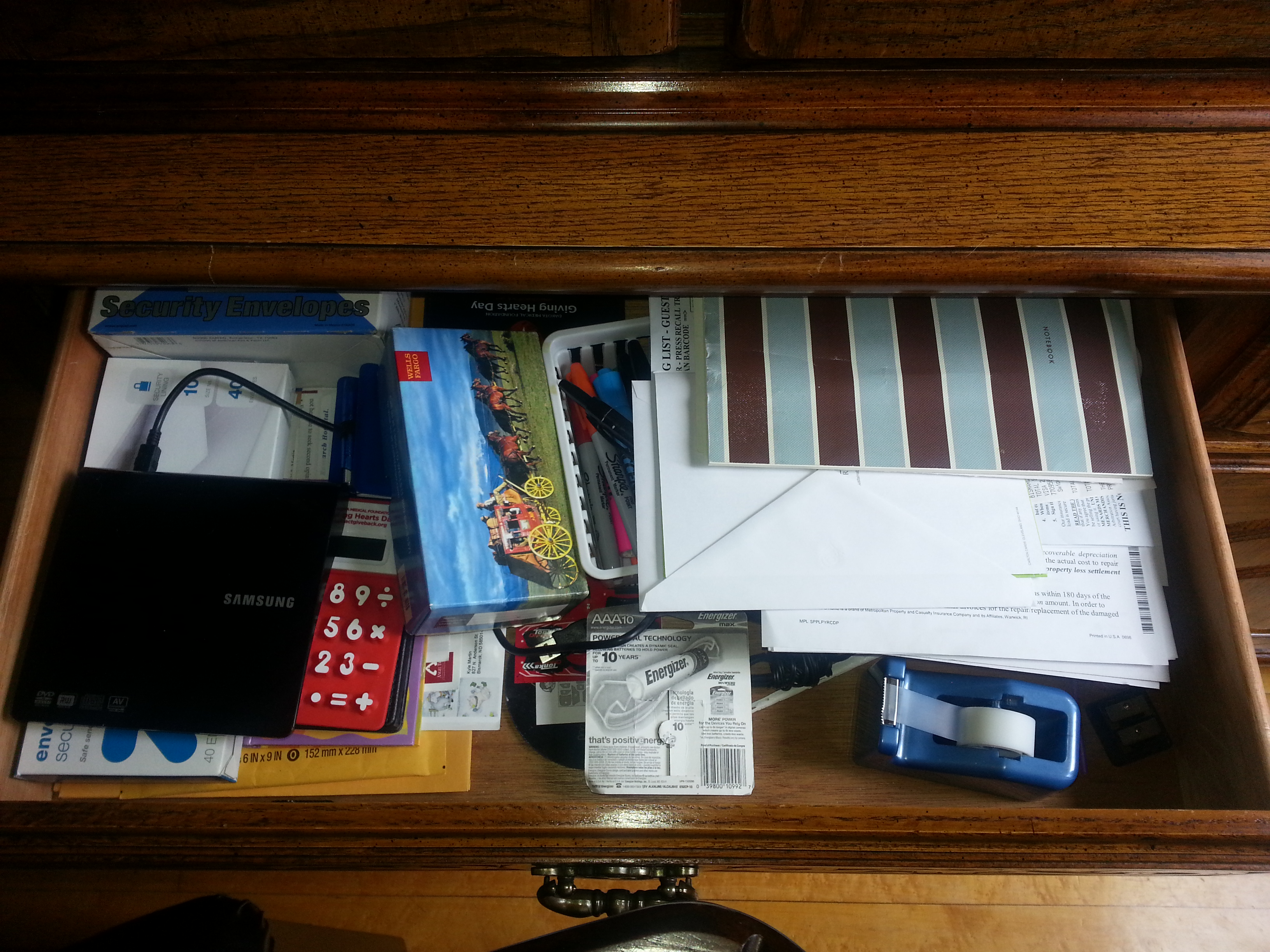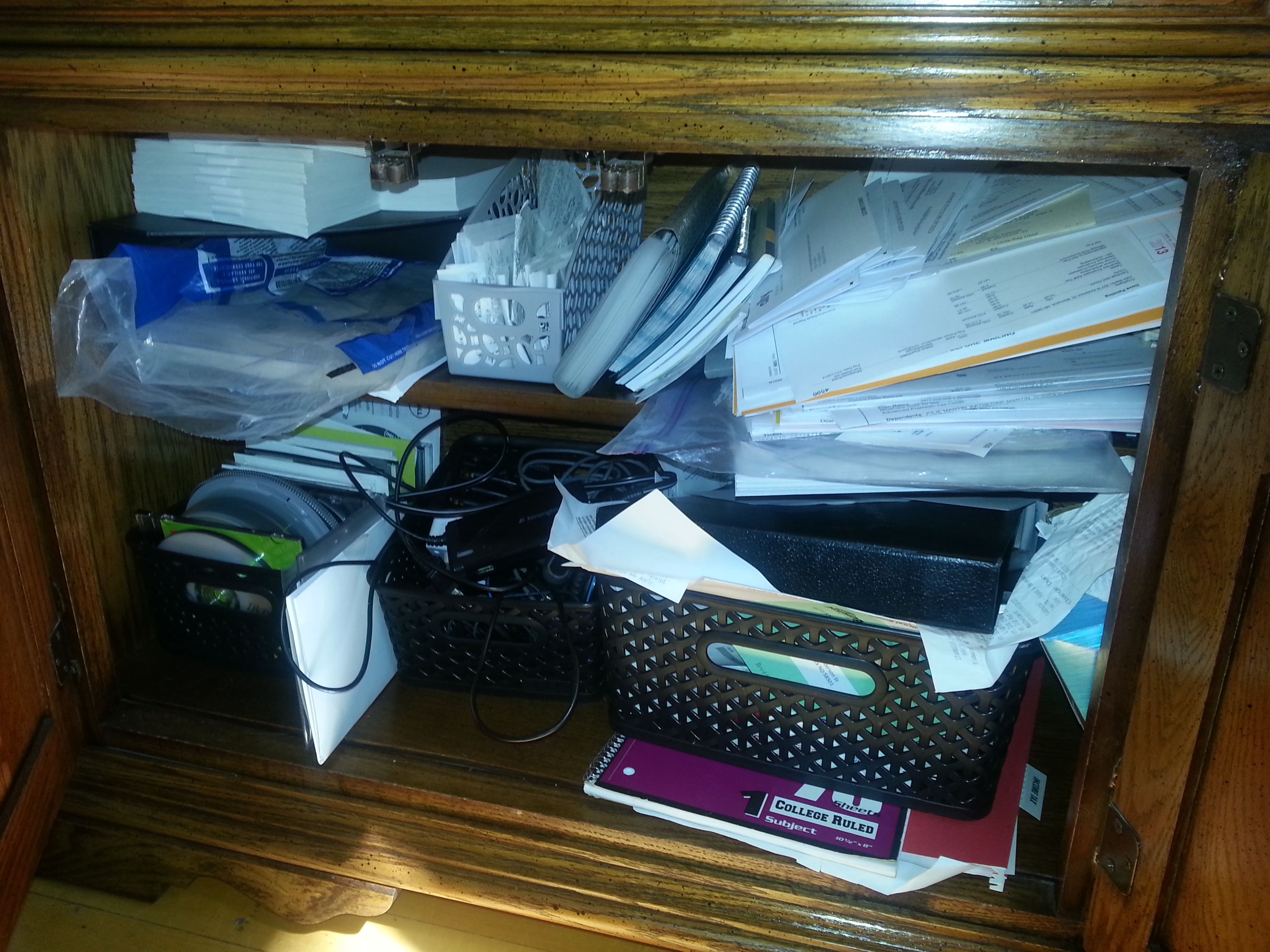 So are you ready to see the before pictures of the inside of my hutch? I bet you have areas of your house just like this. For some reason, I forgot to take a before picture of the second drawer in the hutch. It wasn’t as bad as the first drawer though. The first cabinets were worse than the second cabinets. Paper for filing kept on piling up and making more of a mess each time I added more.