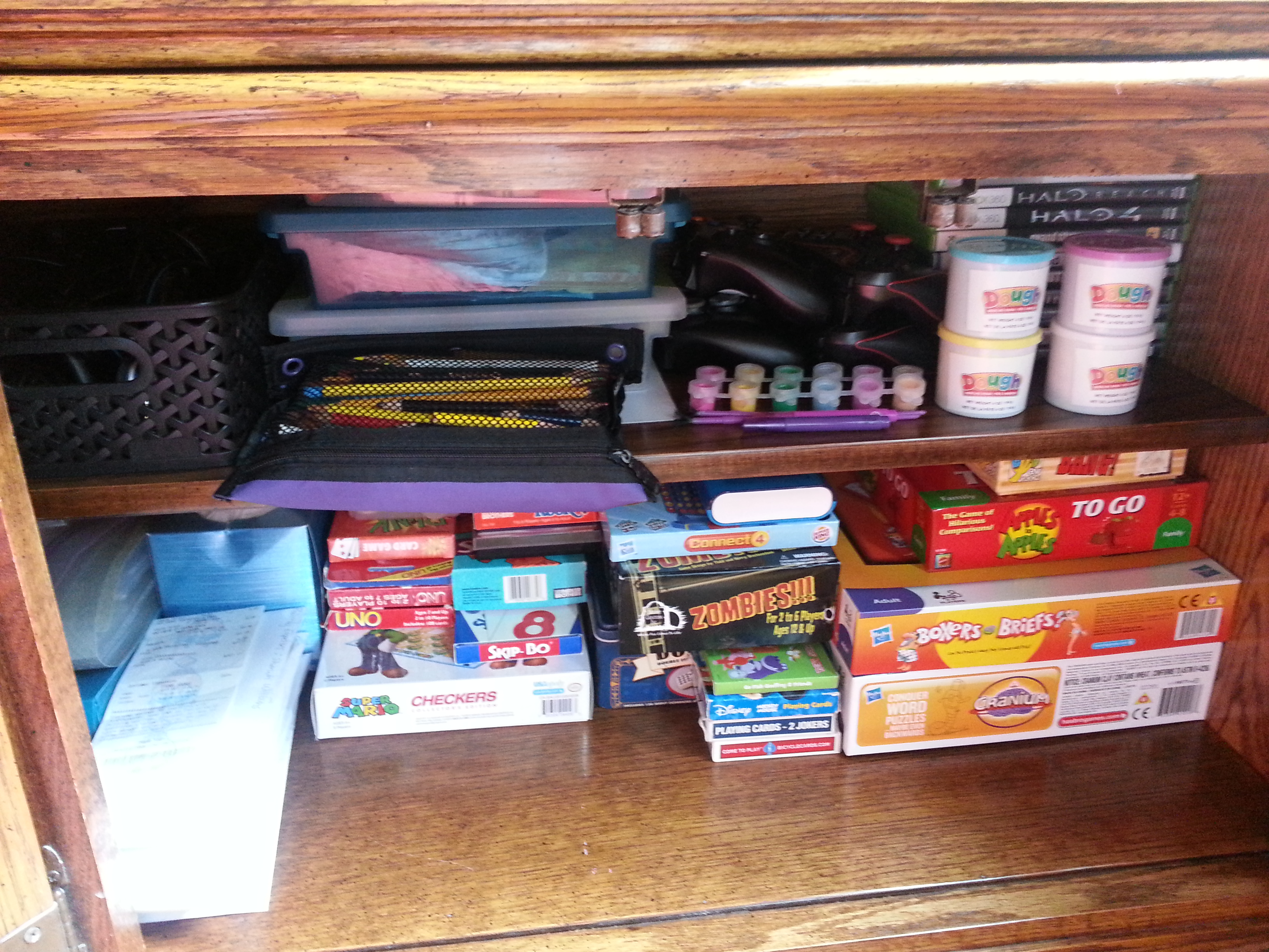 So here comes the after pictures. The first drawer has my personal office supplies. The second drawer has my husband’s business cards and other work and photography supplies. The first cabinet top shelf has four baskets: to file, mail, cds, and chargers. The first cabinet bottom shelf has my work supplies. The second cabinet top shelf has some of my girls’ art supplies and video games/controllers. The second cabinet bottom shelf has our card and board games.