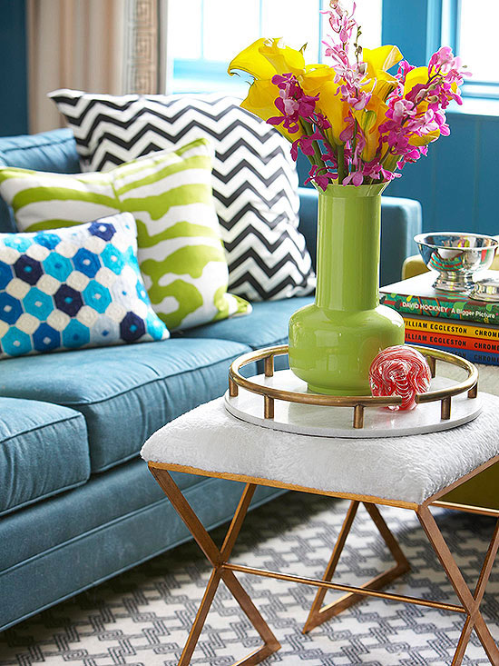 1. Add color. Bring color into a room by adding colorful decor. The color can be from a rug, art, or any other decor item.