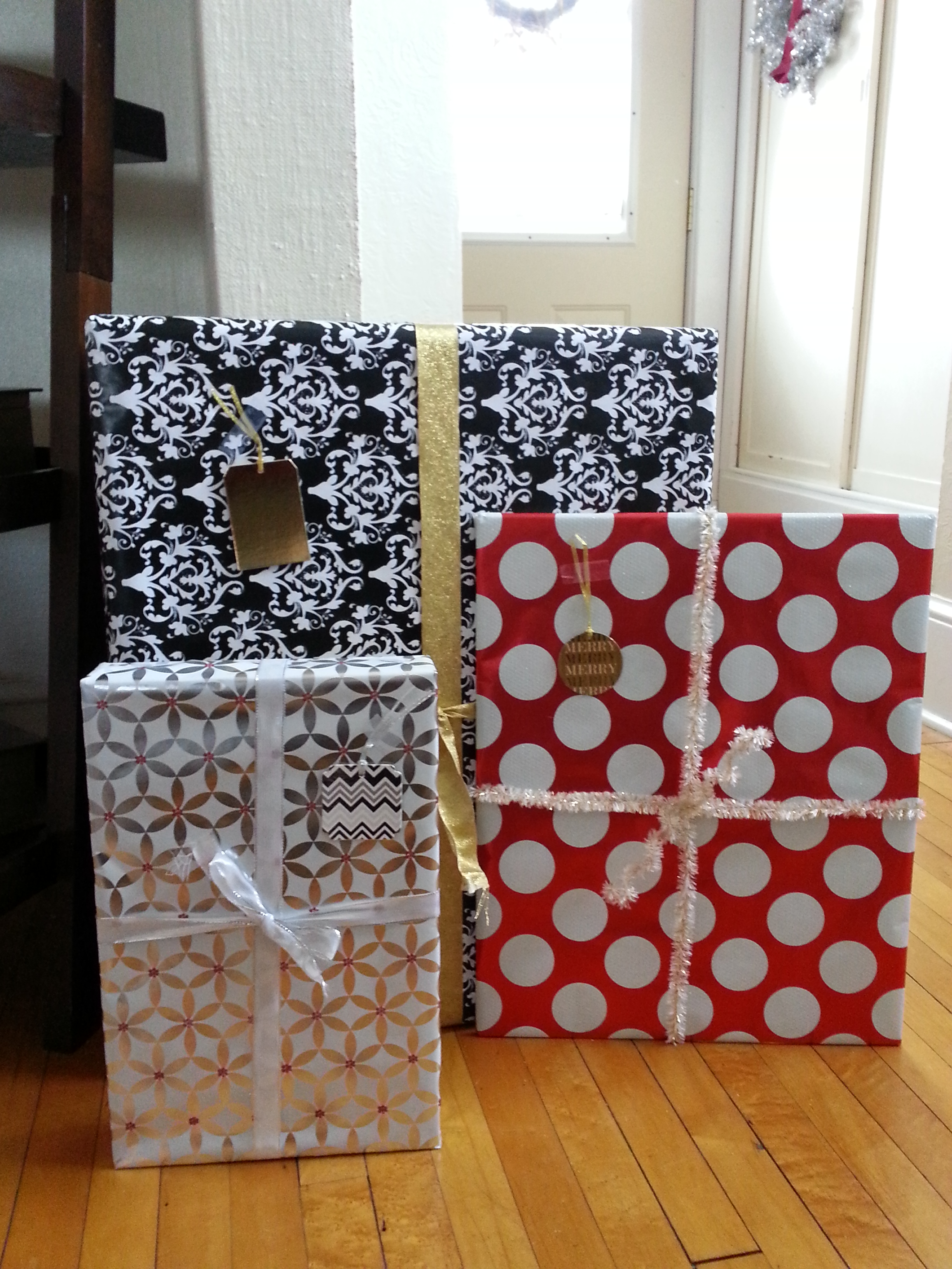 For the other presents, I used the three rolls of wrapping paper I had leftover last year in black, red, and white. I bought new ribbons and tags in gold and silver from Target. I still have some wrapping paper left for the other presents that I still need to wrap, but I may need to buy another roll for any bigger sized packages. I love how the presents turned out. The ribbons look great against the wrapping paper.