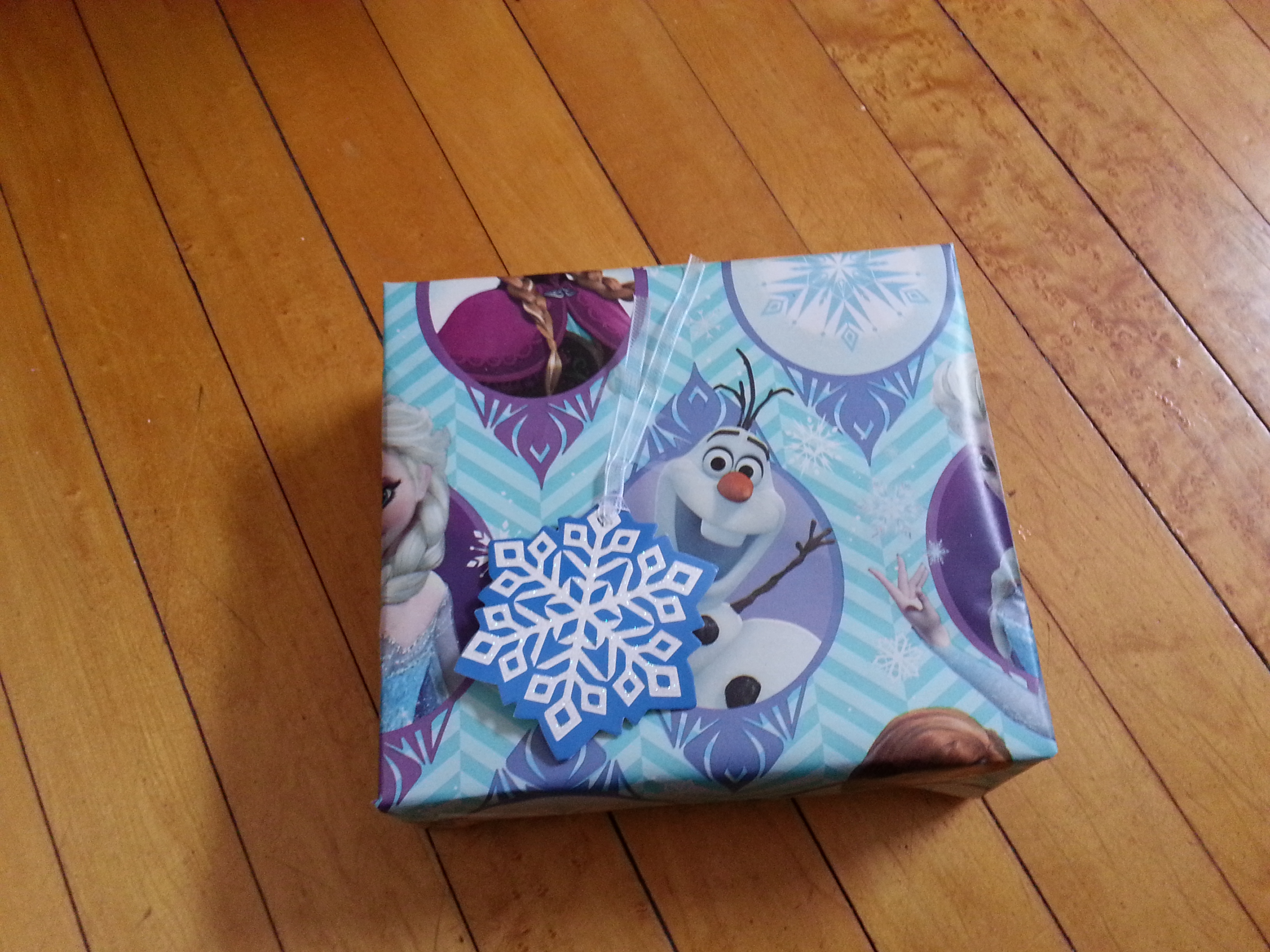 For my girls’ presents, I bought a roll of Frozen wrapping paper and a package of snowflake tags at Target. I thought the snowflake tags would work perfectly with the Frozen wrapping paper. The Frozen theme goes with my girls’ Christmas stockings.