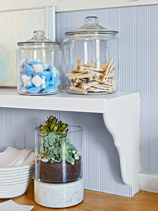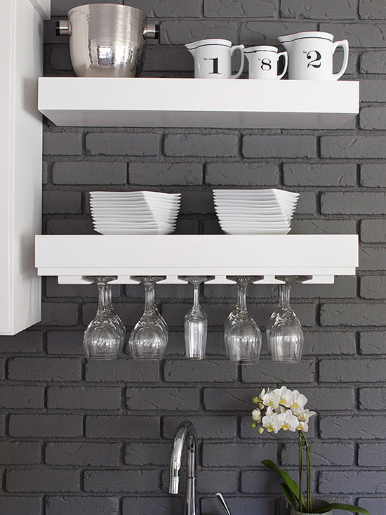 3. Add a shelf above a counter top. The shelf will give you extra storage of any items you need in a certain space. Plus it gives you more room on the counter top. Place any items used often on top of the shelf. A floating shelf would look great in my kitchen. I could add items on top such as my baking jars to decorate the shelf up a little bit more.