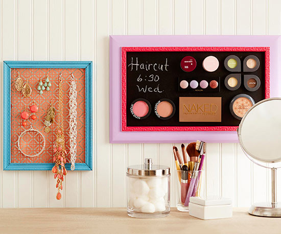 4. Hang items on picture frames and place on walls. Add decorative colors and patterns to the frame to create extra interest. Place items such as jewelry or makeup on display. You will save counter space and will also show off some of your items.