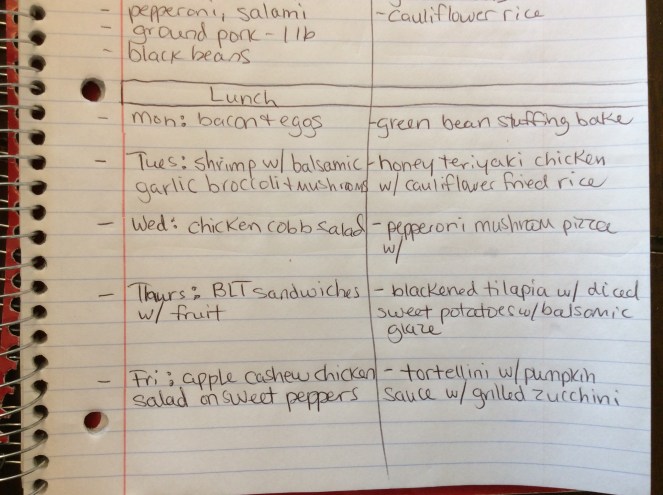 3. Create a list of 5-6 meal ideas each for lunch and dinner. On this list, I have several easier meals for those days/nights that I need something quick to cook. I make two lists: one for home and one for school lunches for my daughter Katie. I’ll talk about packing school lunches in another post. For my girls’ meals, I try to make them something very similar to what my husband and I are eating. I’ll usually add a vegetable I know they’ll eat and some fruit or yogurt pouches. There are some meals that I know they won’t eat, so I’ll make them something different.
