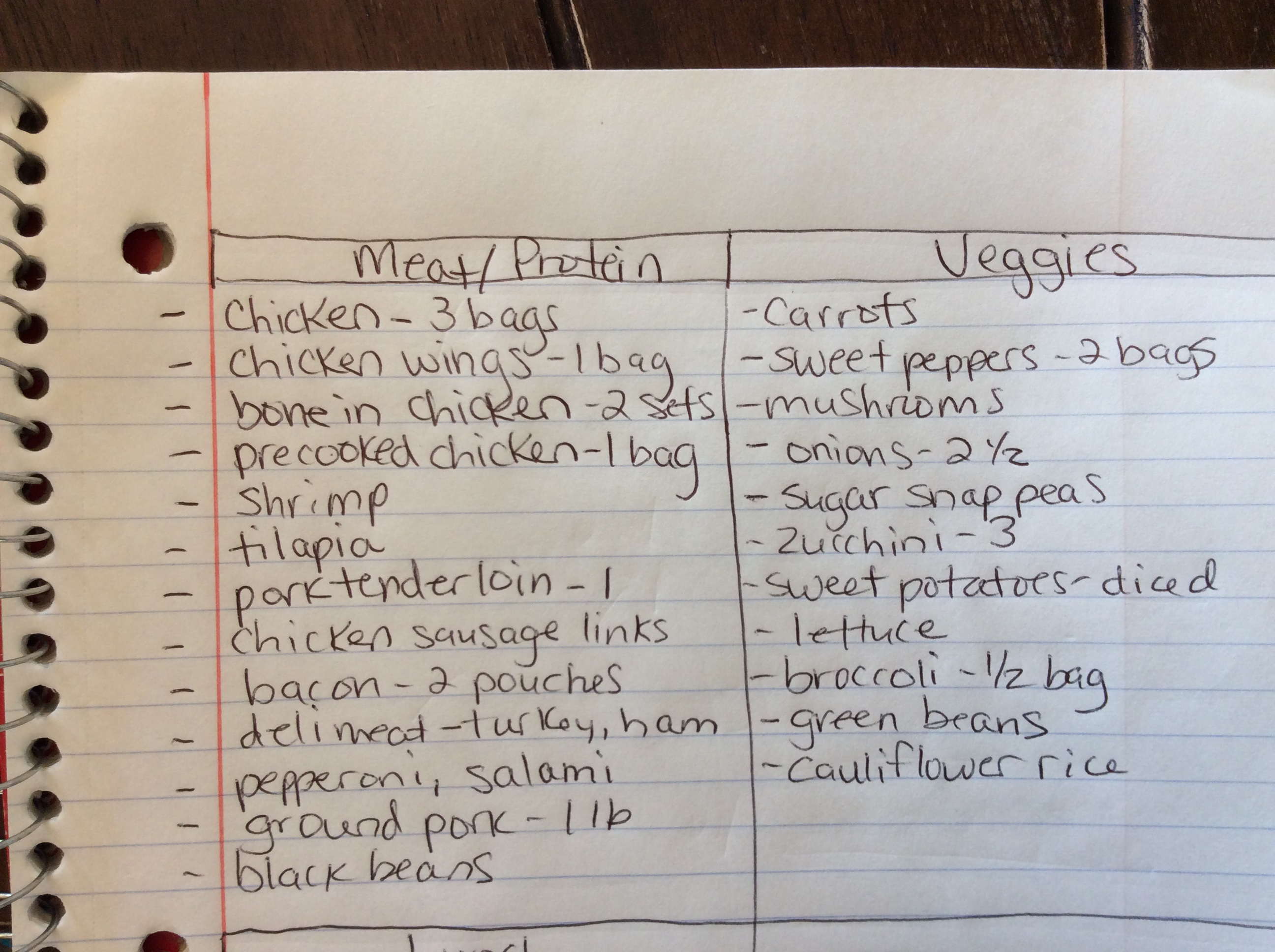2. Create a meat and vegetables list of what you currently have in your fridge/freezer. Having this list makes it easier for me when planning out my meals. That way I know how much meat and vegetables I have and what I’ll need to add to my grocery list.
