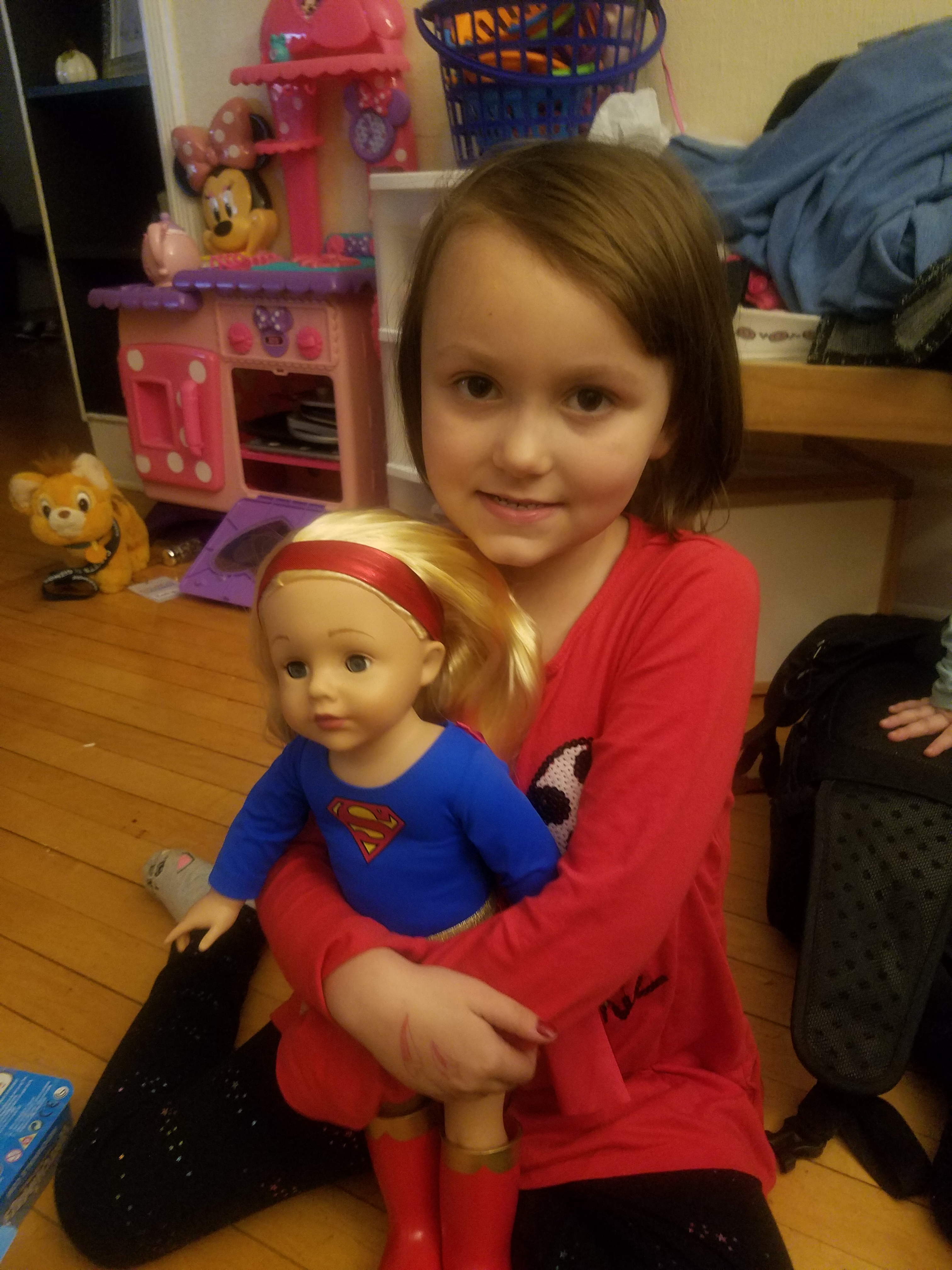 Katie had a Superhero themed party at Space Aliens. She had a few of friends from school at the party and they all had a blast. Here is Katie with her new Super Girl doll from her Grandma.