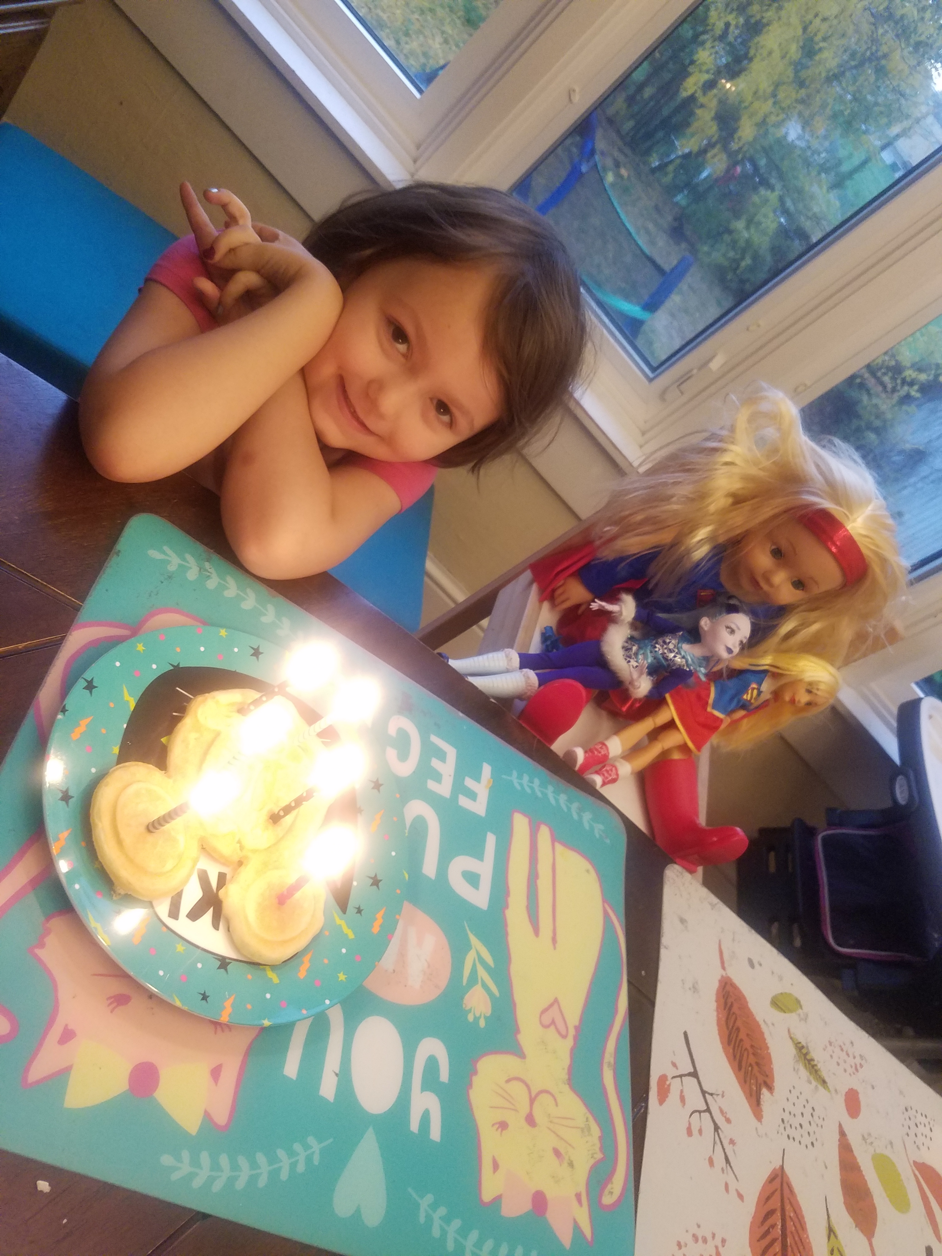For Katie’s birthday, we spent a fun day at home. For breakfast, I made Mickey Mouse waffles. And of course, we had to put 6 candles on her waffle. Katie had her new doll and barbies sit next to her while she ate.