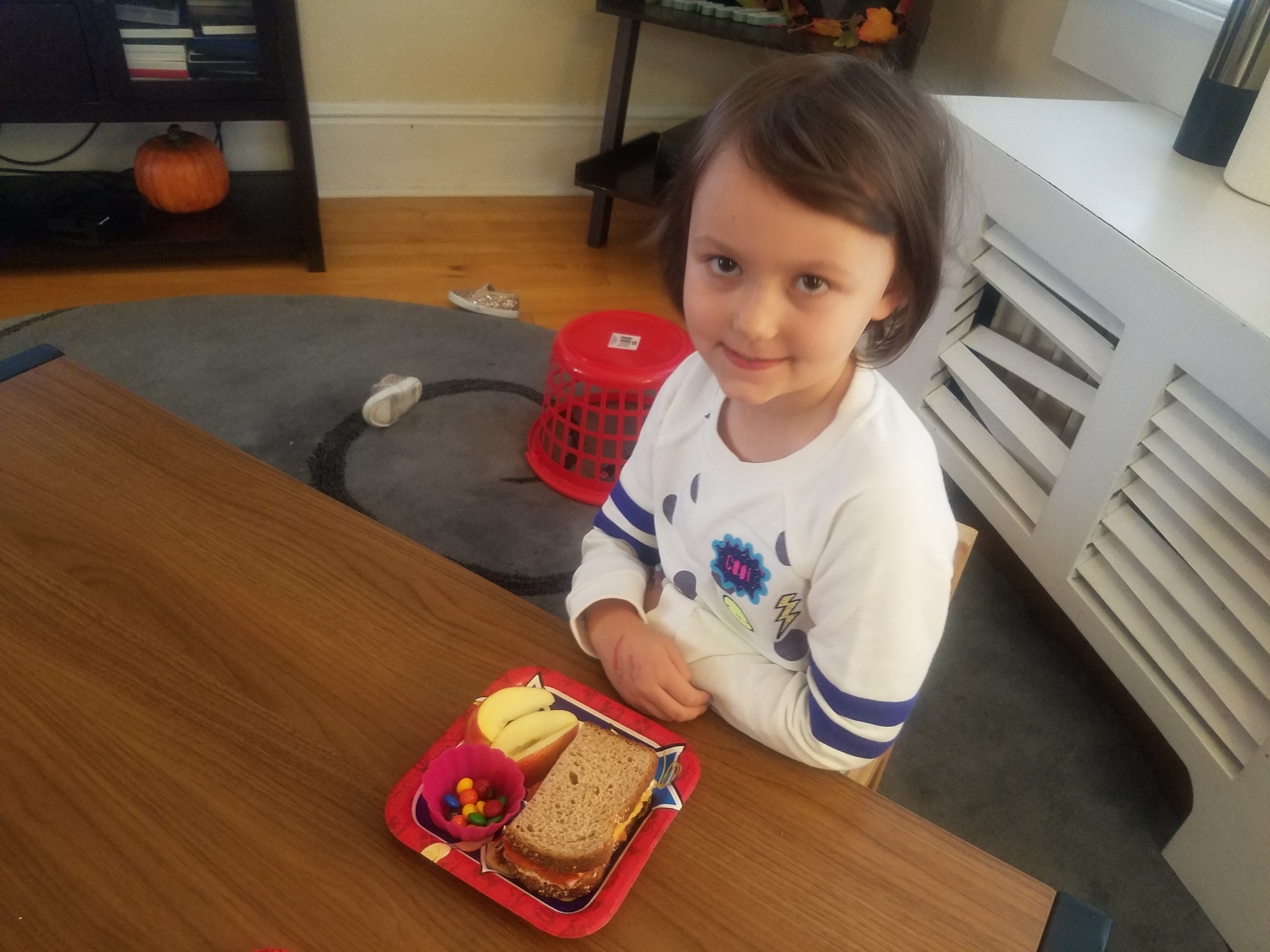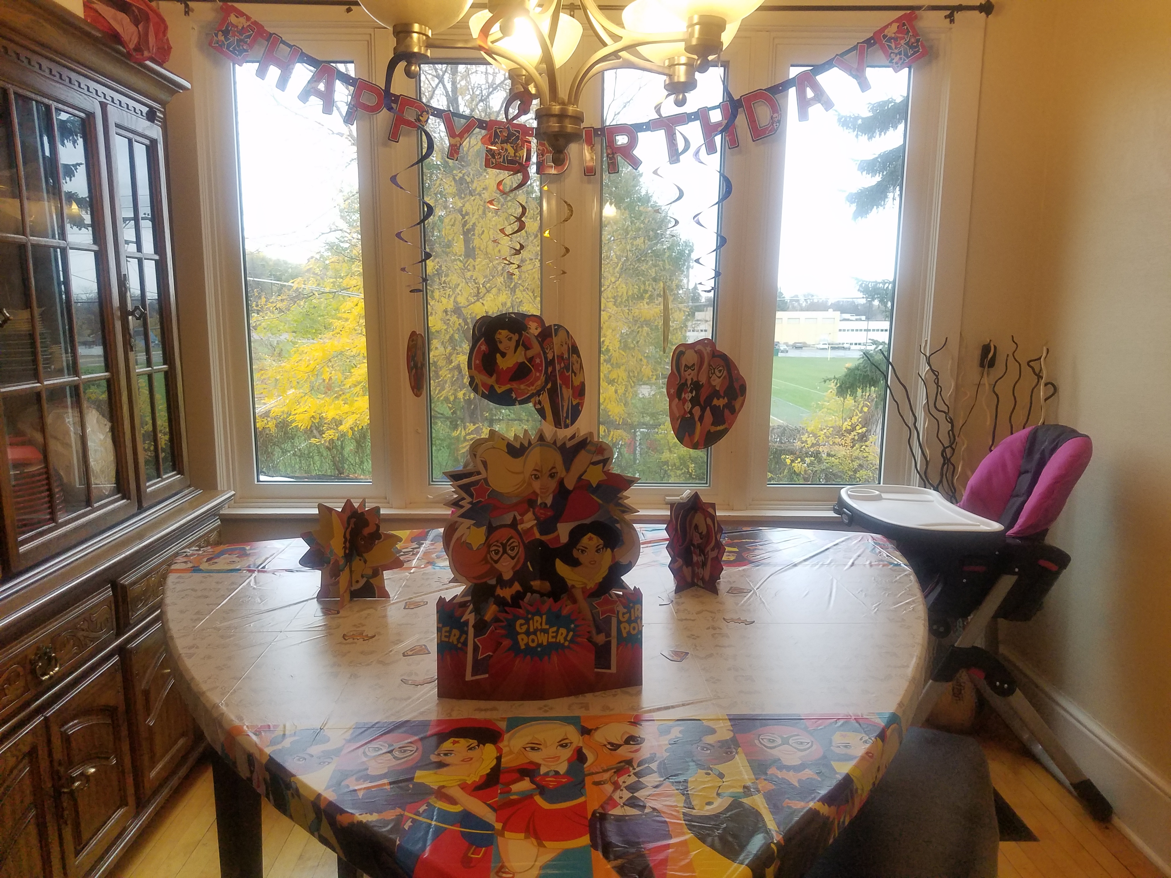 I decorated the dining room table with Superhero Girls decorations to make it fun for Katie’s special day.