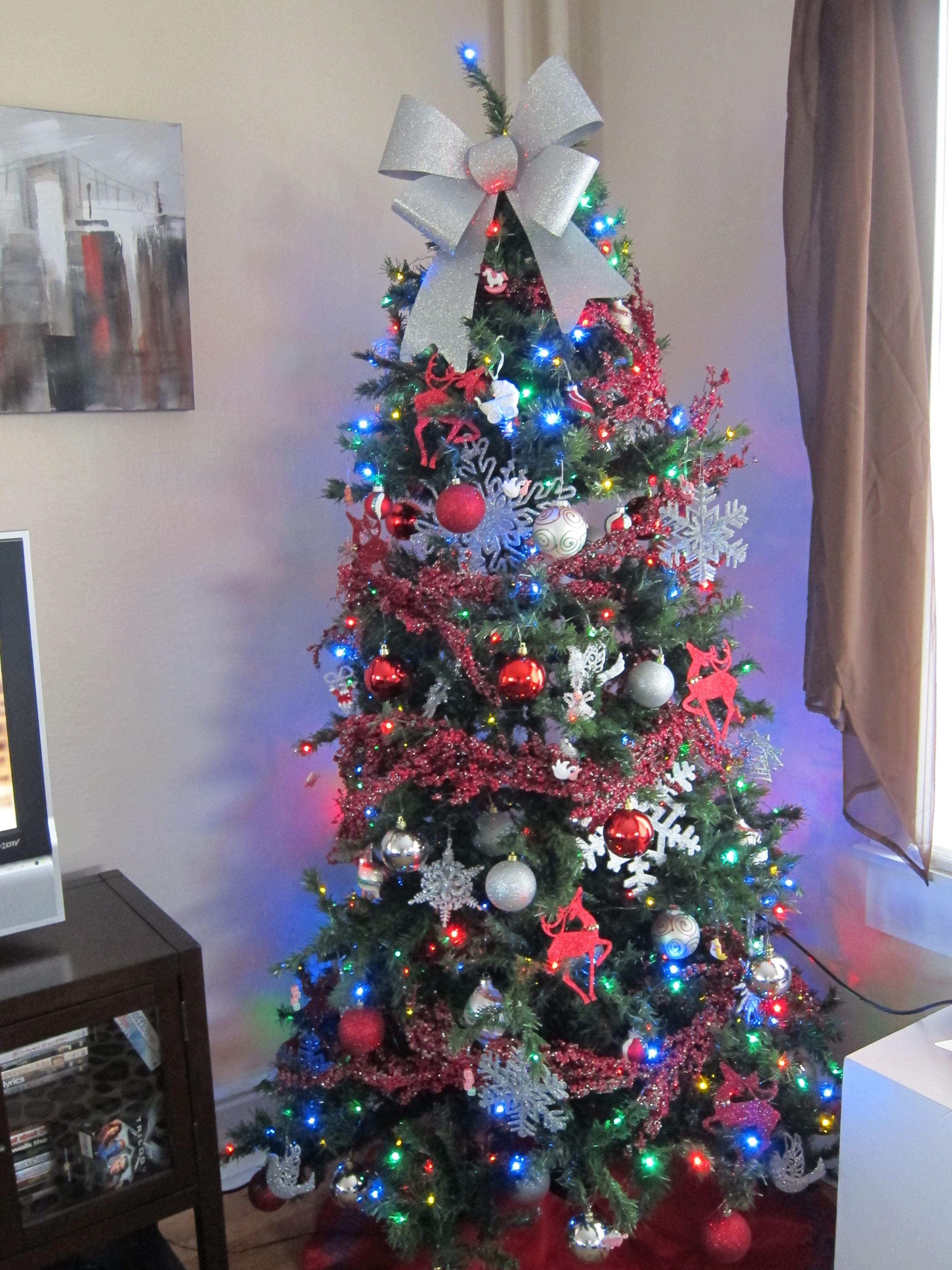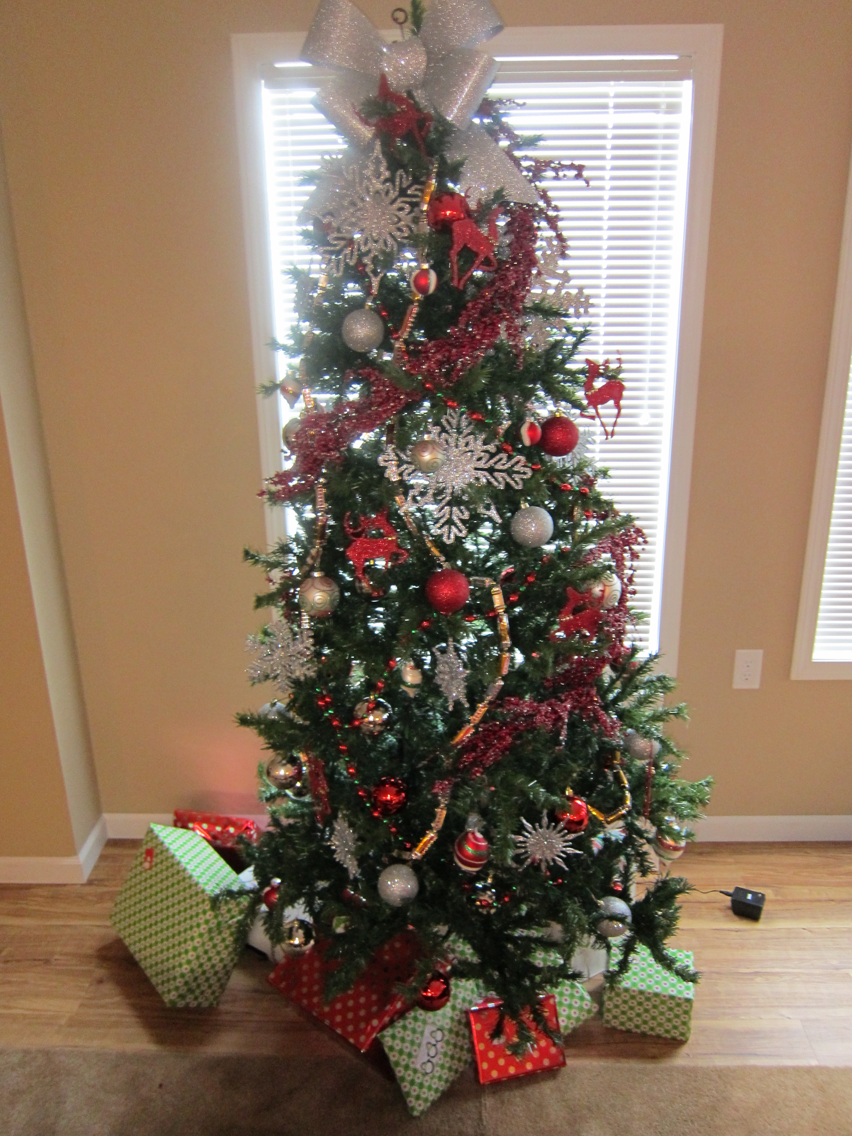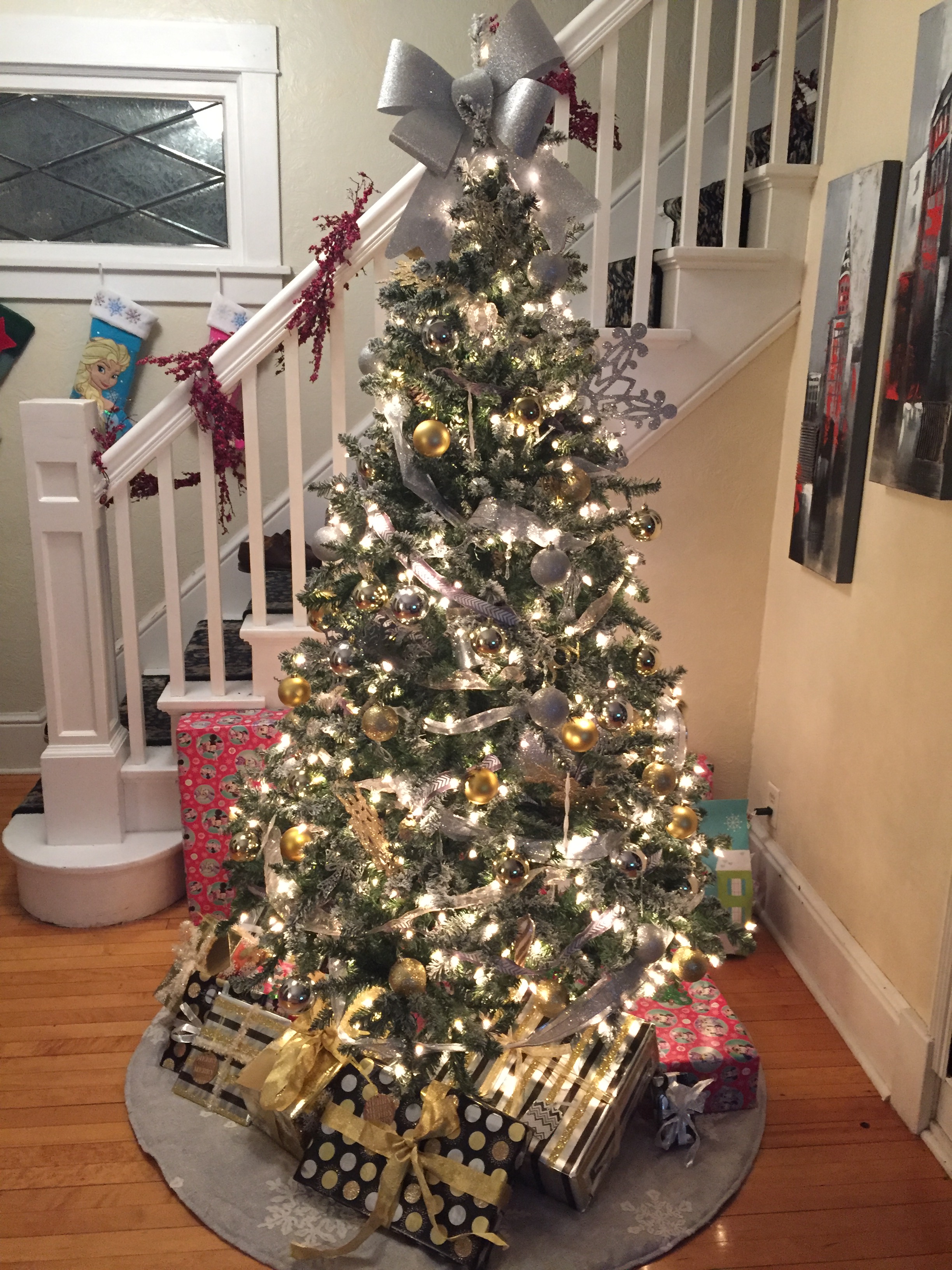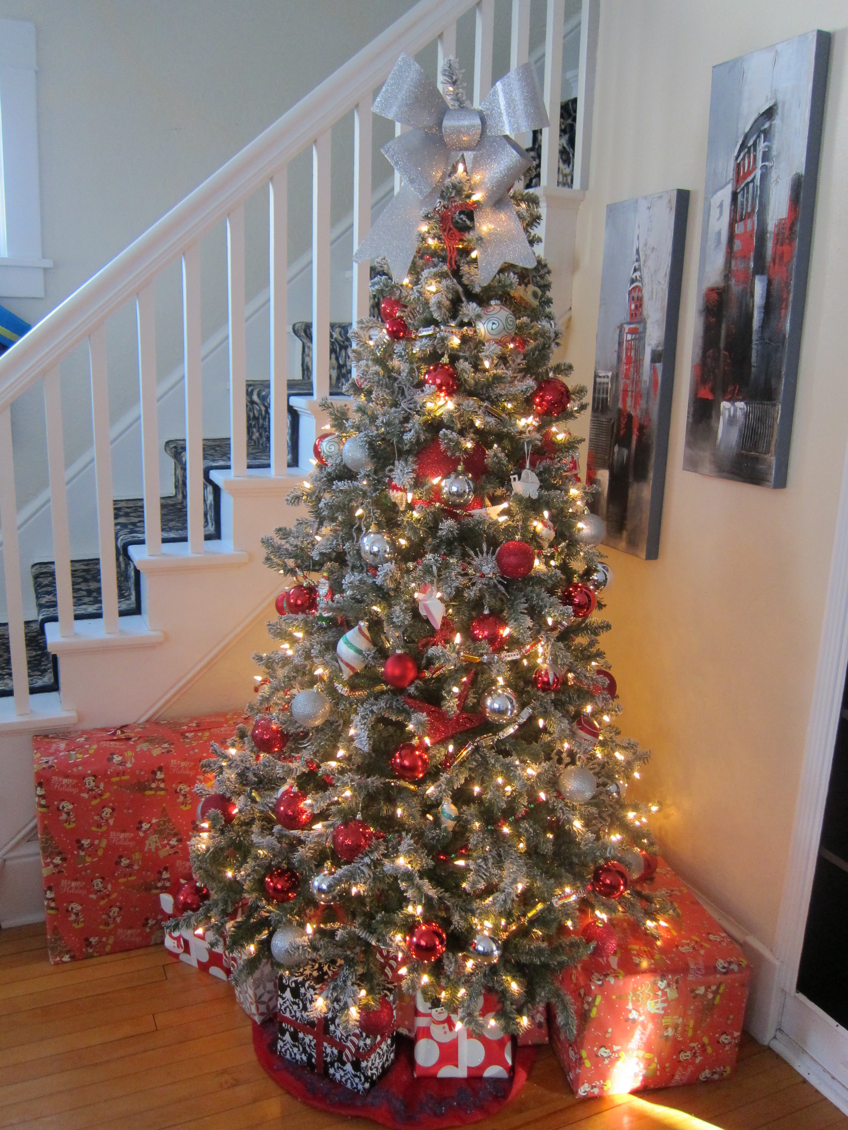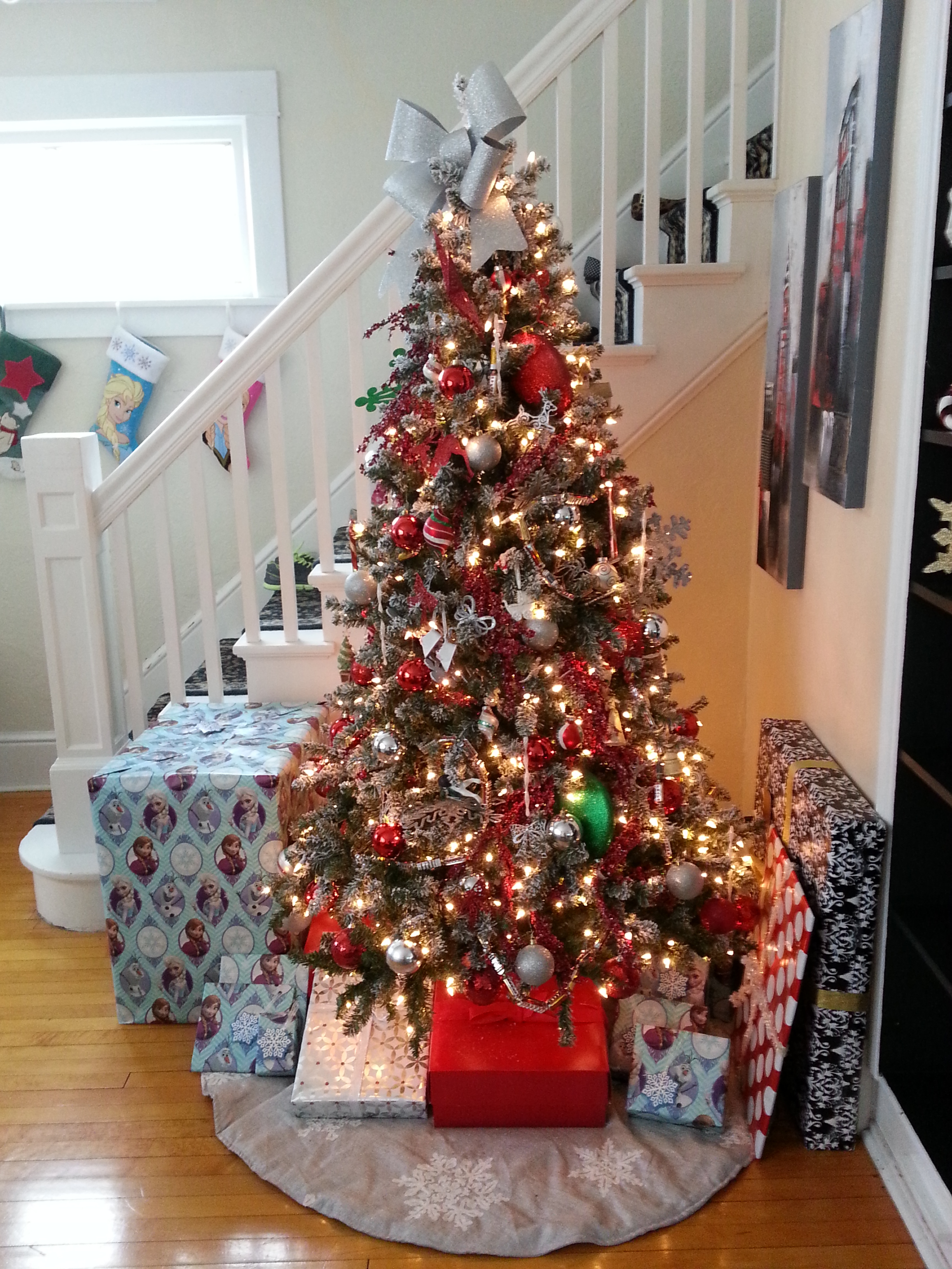 In 2013, we had a second baby girl, Sophia, in February. We bought a new Christmas tree during Black Friday. We bought a frosted tree, which I really love. I decorated the Christmas tree with red and silver again. I started wrapping my presents more fancy that year. You can check out the rest of my house in 2013 here.
