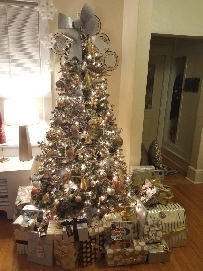In 2015, I wanted to change up the decorations on the Christmas tree. I went with the classic gold and silver. I had bought a box of clearanced ornaments that year before. I used ribbon as garland around the tree. I continued wrapping my gifts even more fancier. I love making my presents look pretty.