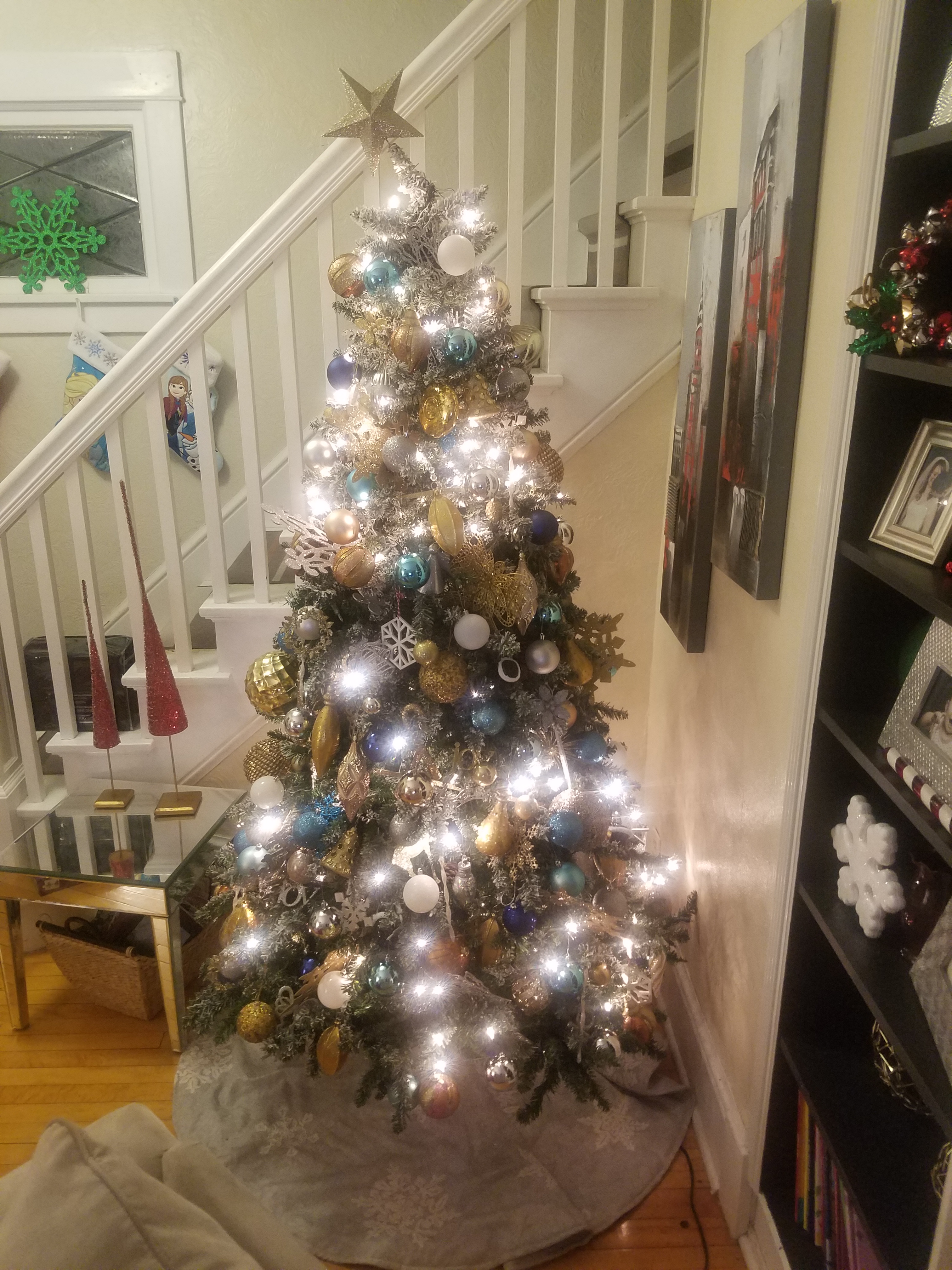 This year, I wanted to add blue and white to my Christmas tree. I bought couple cases of blue and white ornaments clearanced last year. I also bought a new gold star tree topper. I haven’t wrapped the presents yet. I’m still on the look out for blue ribbon. Otherwise, I have already bought the wrapping paper.