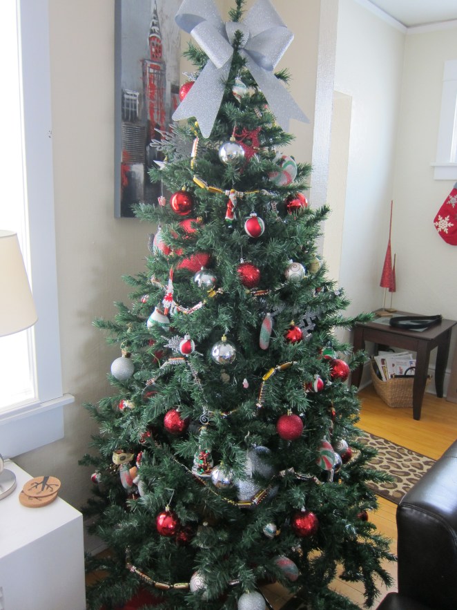 In 2011, we bought our first house and had a baby girl, Katie, that October. I went with the classic red and silver again and added baby decorations to the tree.