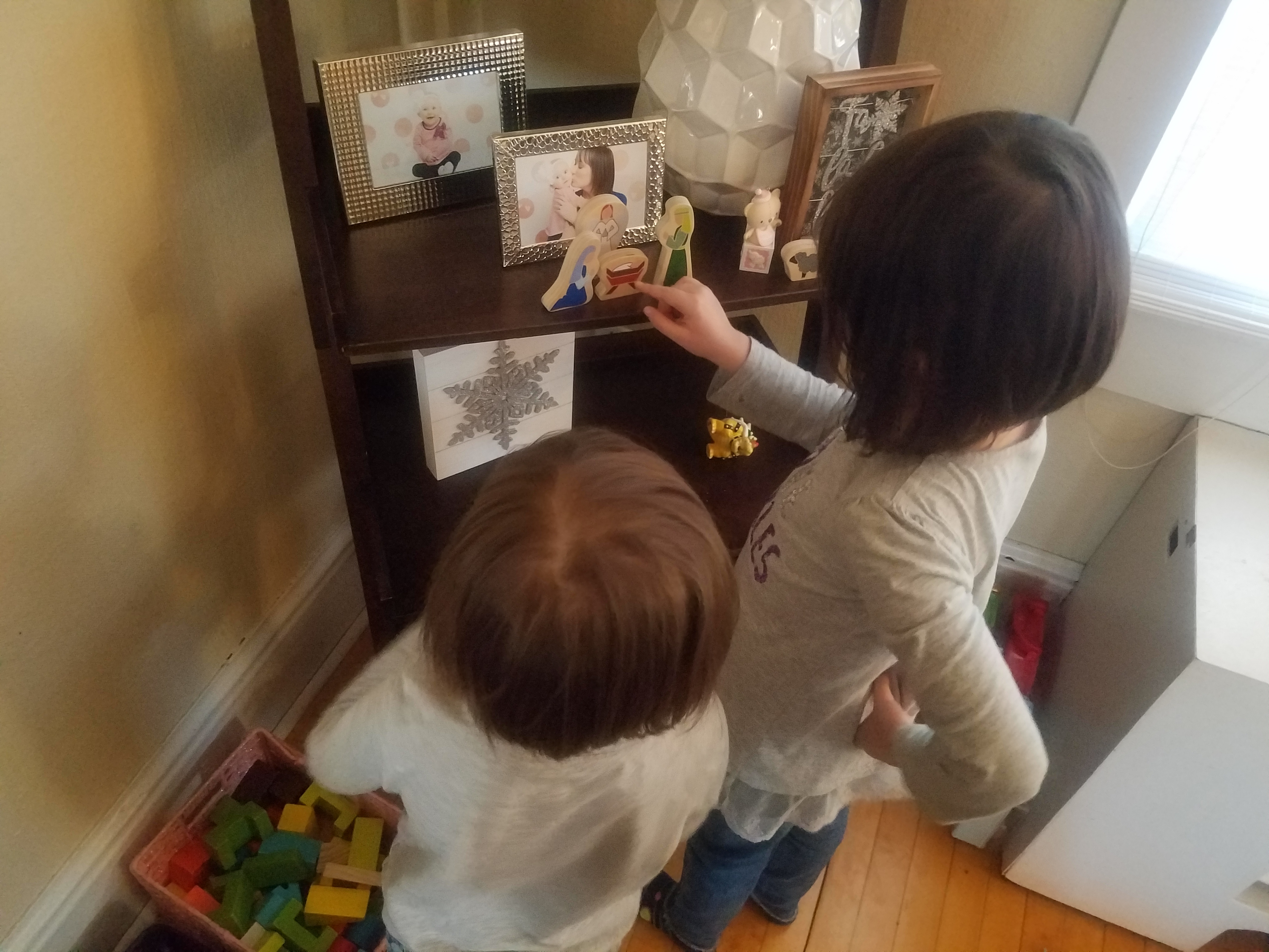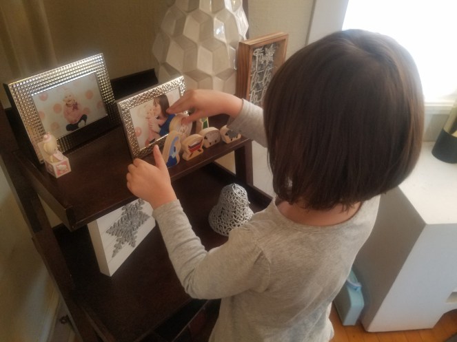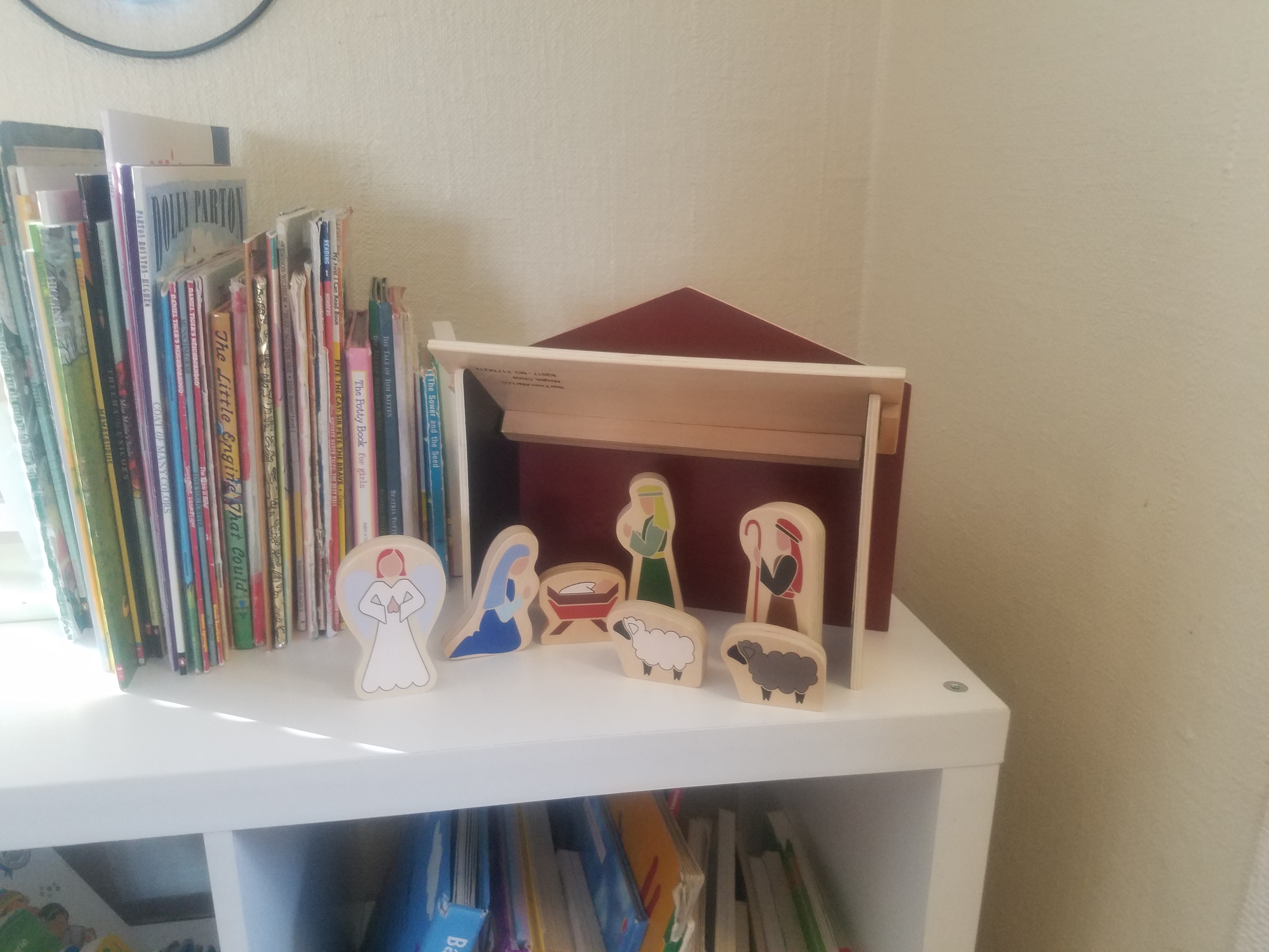 We have the nativity scene set up on top of a bookshelf where my girls can play with the character pieces anytime. It’s a nice location to see the stable every day as a remember about the story of the birth of Jesus.