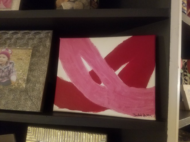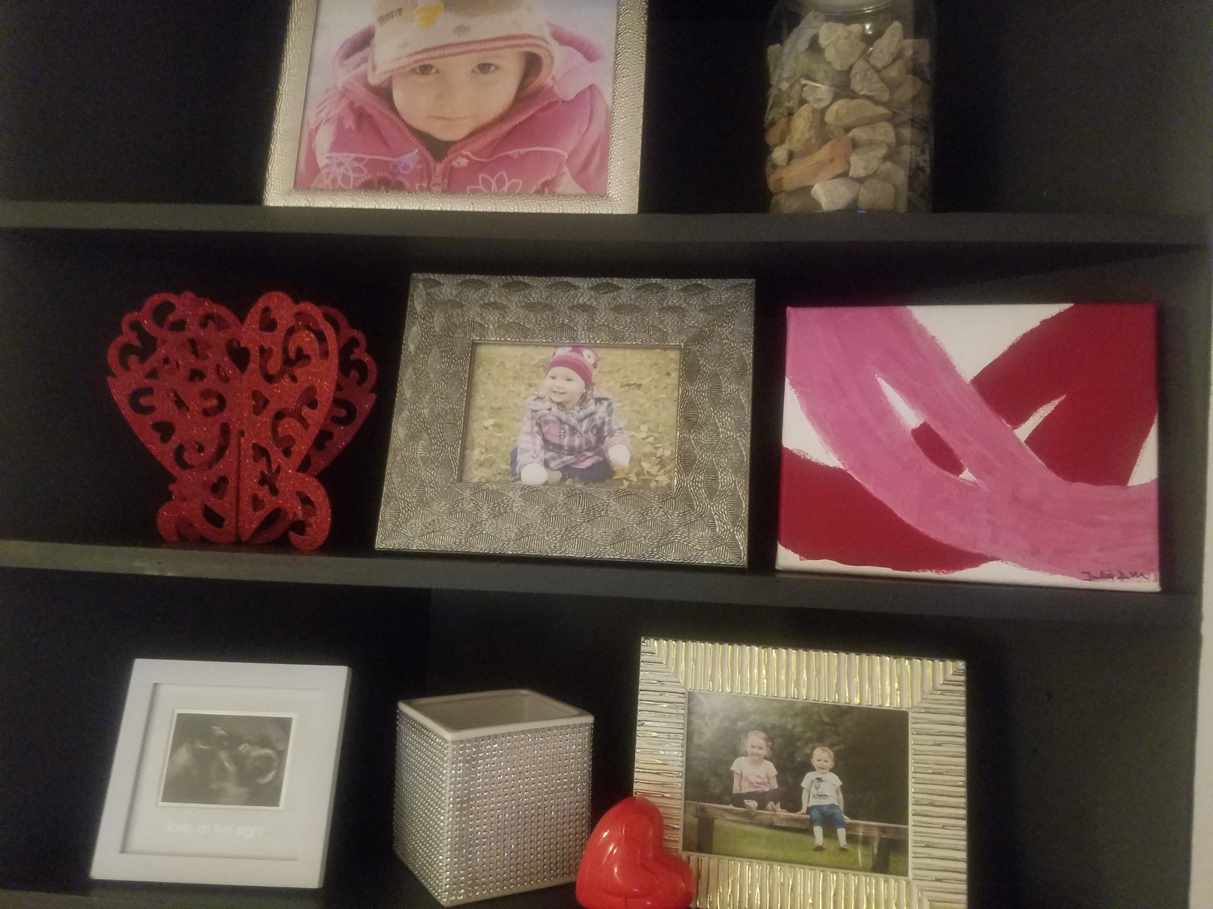 I thought my heart painting would look perfect with my Valentine decorations. I added it to my built-in bookshelf in my living room.