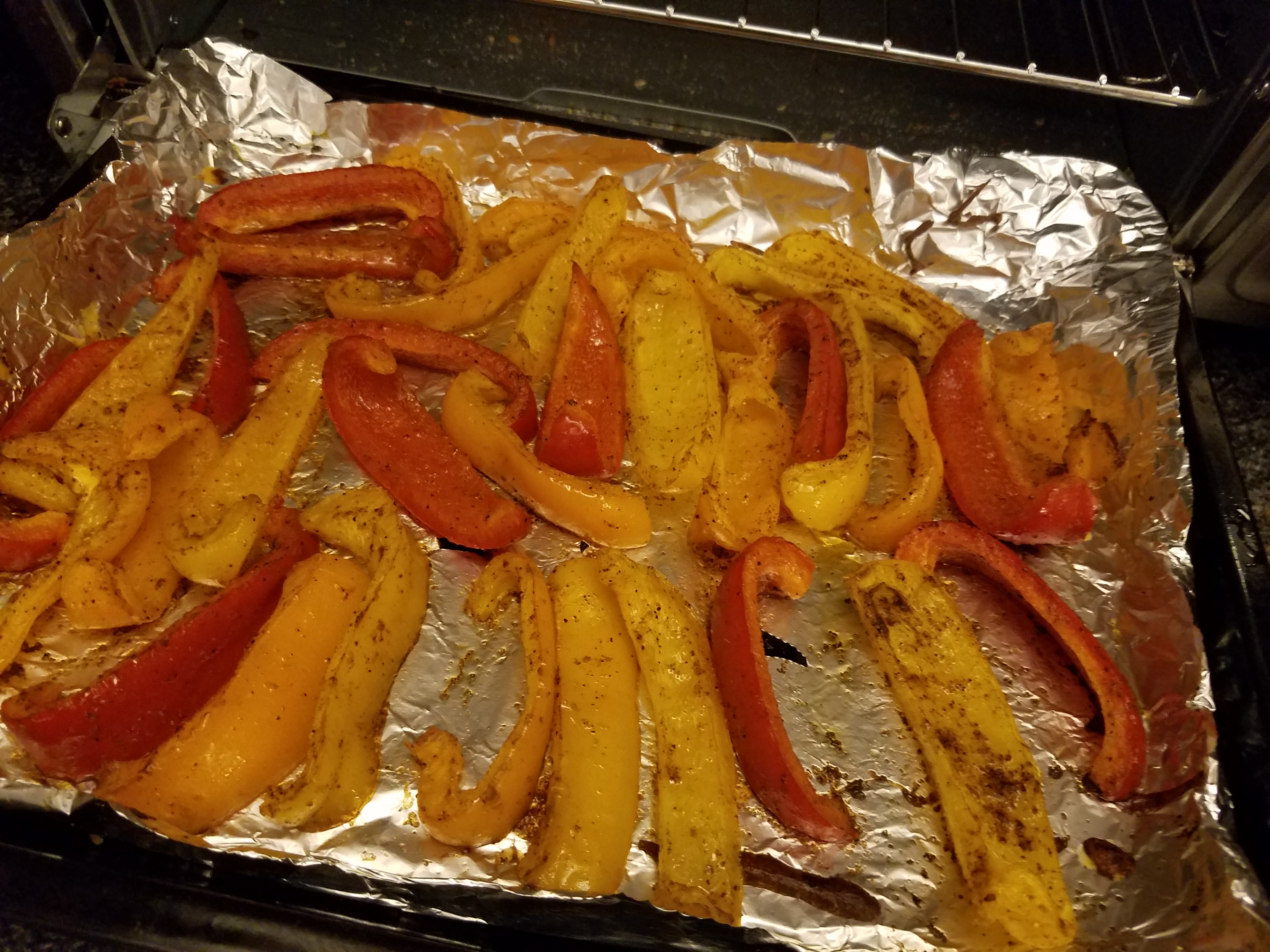 - Place peppers on baking pan (or toaster oven with tin foil); bake for 10 minutes.