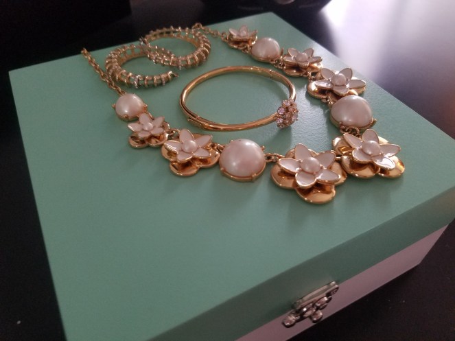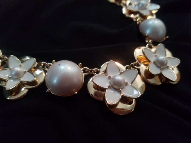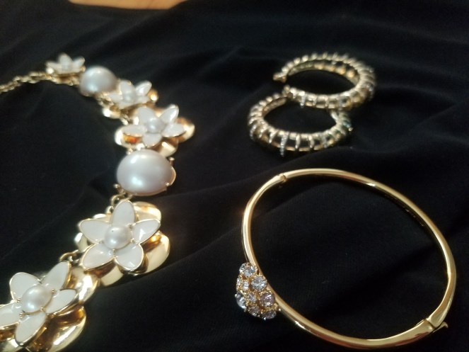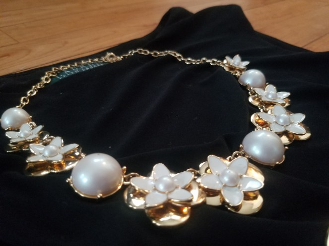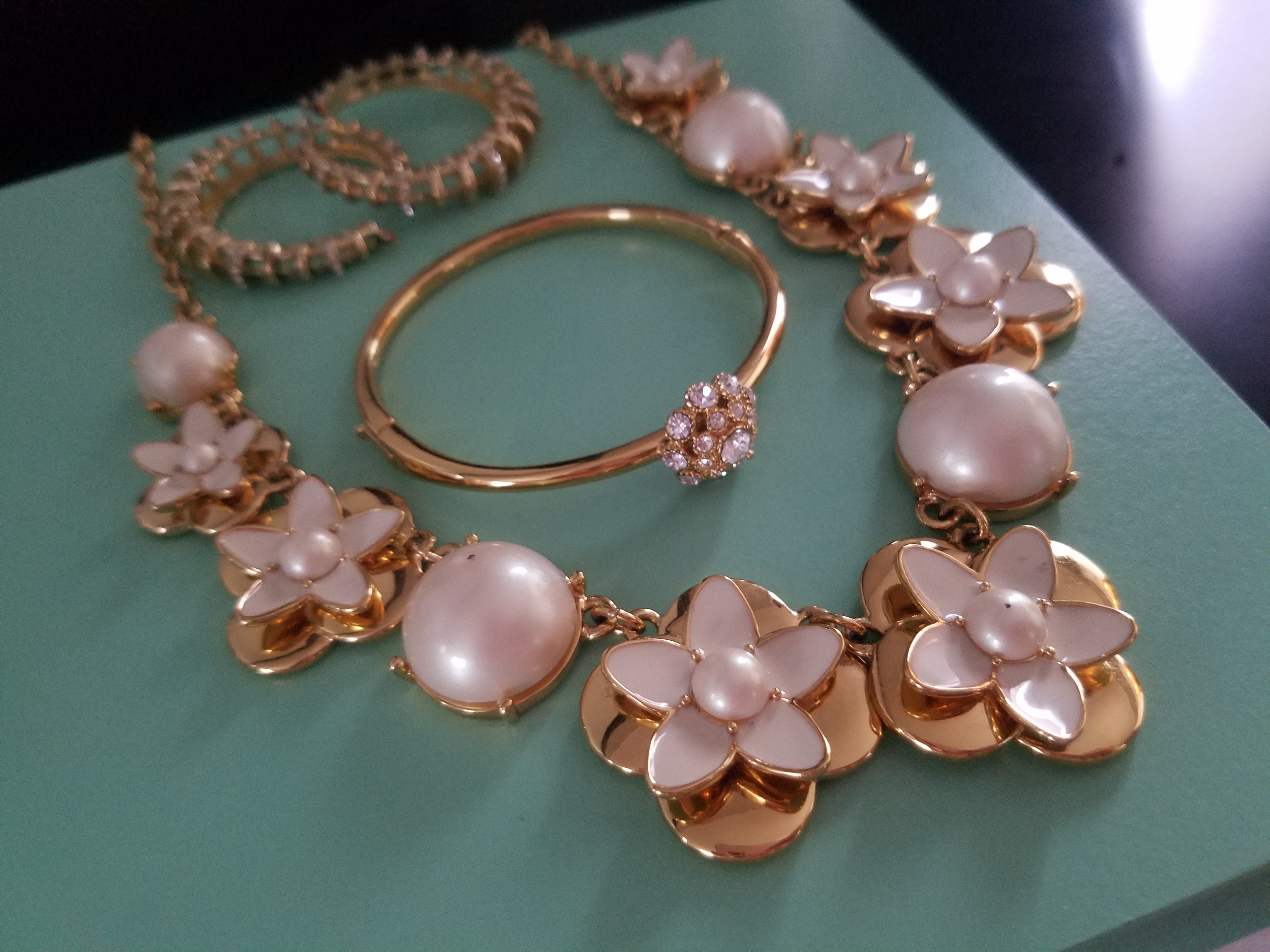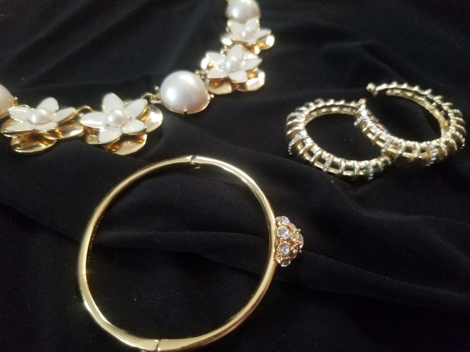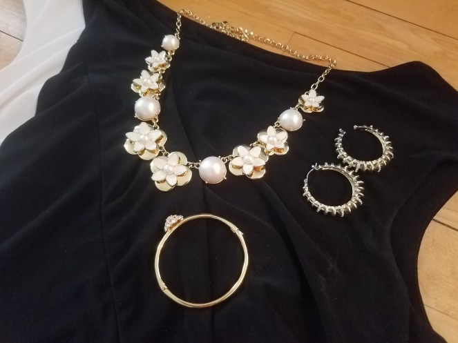 If I wore my black and white dress on a date night, I would wear my Nine West black heels or a favorite pair of flats. As far as jewelry, neutral colors looks the best, such as gold and pearl. For the date night outfit look, I picked my Kate Spade flower gold and pearl necklace and bracelet along with a pair of gold earrings.