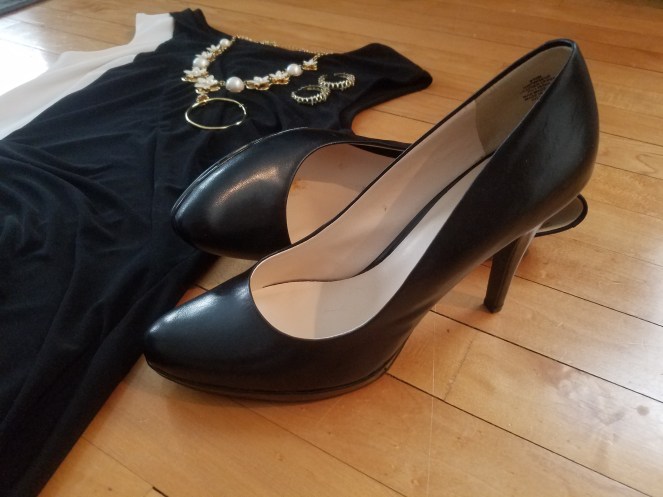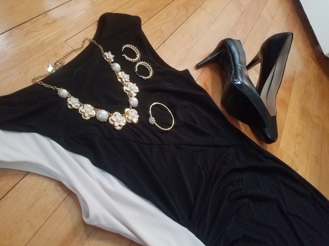 I wore this dress to a dinner gala for my husband’s work couple years ago. This was before I was pregnant with Elizabeth. I felt amazing in that dress. Plus I was at the weight I wanted to be at. So I felt even more amazing. That night, I wore my Chico’s pearl necklace and earrings along with a black bracelet and couple gold bracelets pictured here.