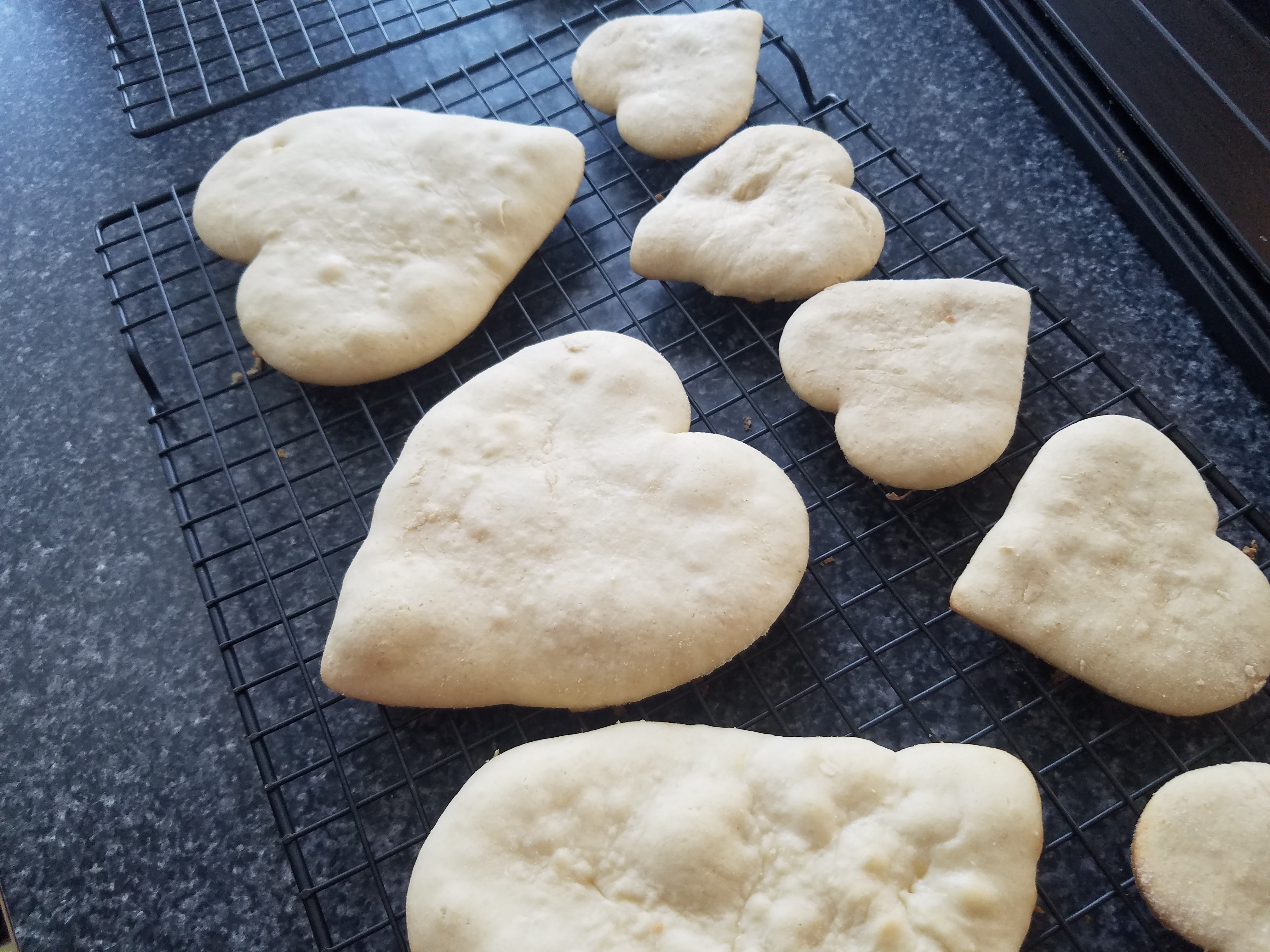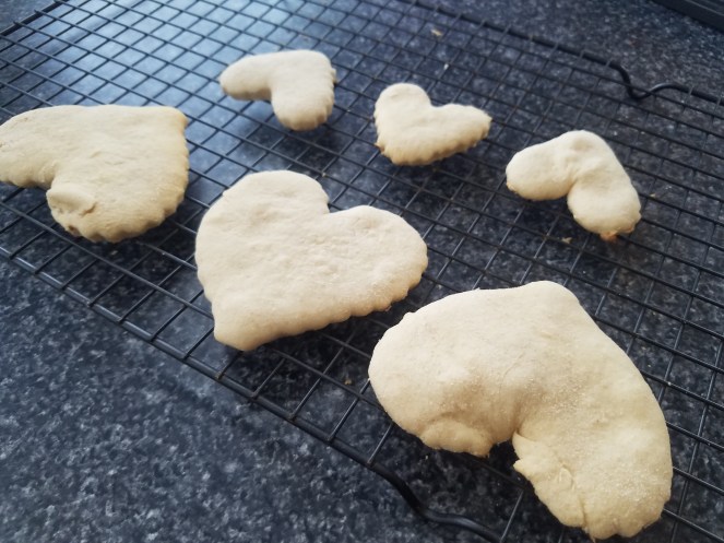 We cut out three big heart cookies (one for each of them) and several different other sizes. I baked them separately so they would all bake evenly. I was able to make 16 cookies in the batch of sugar cookies (using the four different heart shapes). We shared the 16th cookie to taste test.