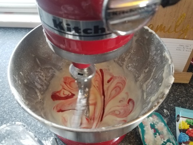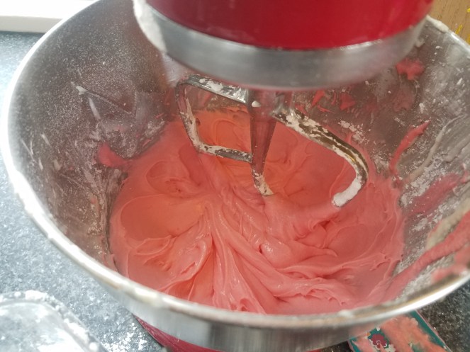 While they were relaxing on the couch, I made the frosting and added red dye to turn the frosting pink. The recipe I used called for 2 cups of powder sugar, but I used 3 cups since I wanted the frosting thicker.