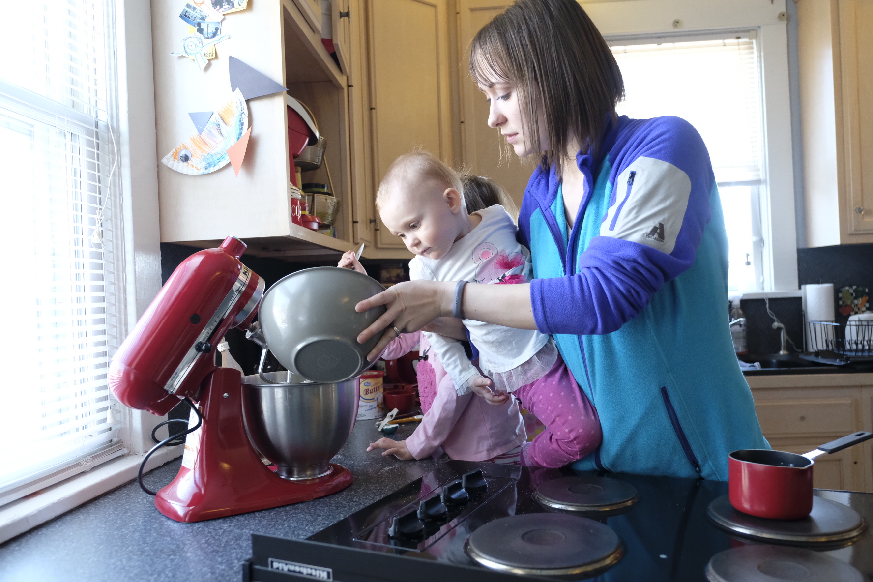 My husband brought out his camera and took pictures of our girls and I making the cookies. Katie and Sophia had lots of fun helping and Elizabeth enjoyed watching the mixer mix the cookie dough. Towards the end, she fell asleep in my arms (it was nap time). Katie and Sophia got to lick the beater and spatula, which is one of their favorite things to do.