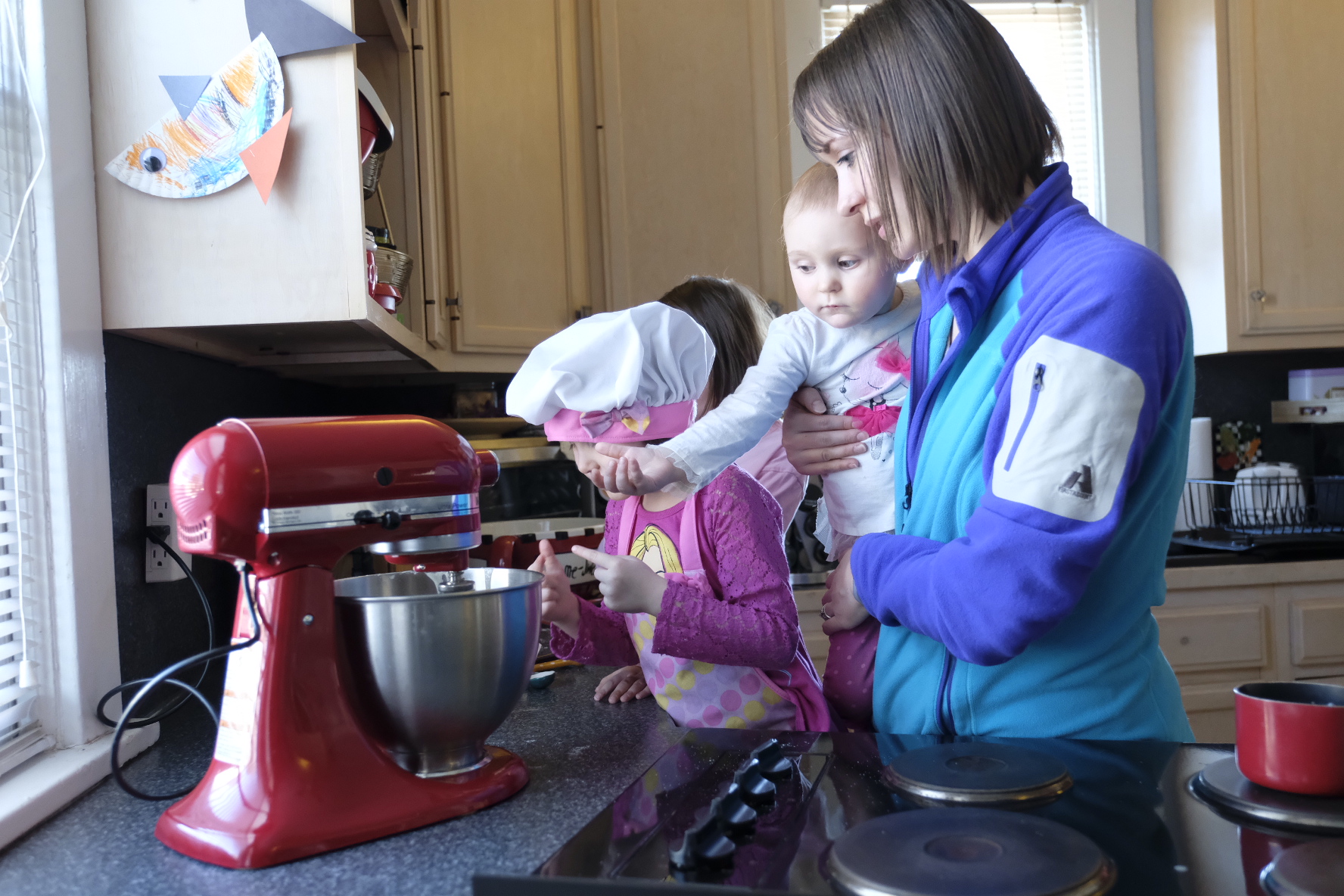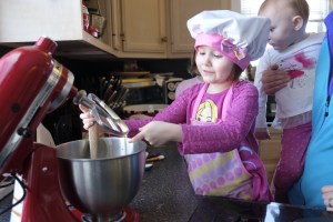 I asked my girls who was ready to help me bake sugar cookies. Sophia was the first one who was ready to help with the cookie batter. She got all excited. Sophia washed her hands and put on her apron and chef hat. Katie wasn’t ready at first, but in the middle of making the cookie dough, she was ready to help. Then Elizabeth decided to join in too.