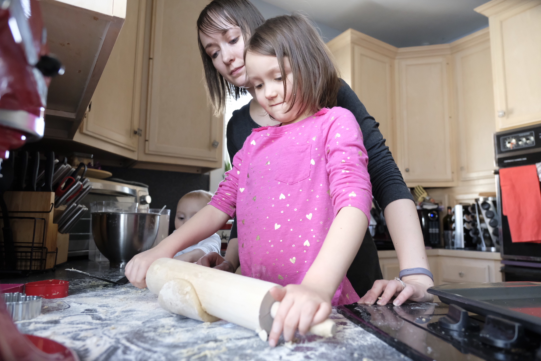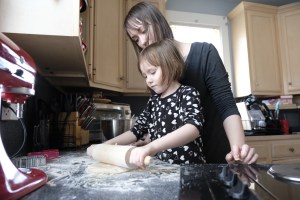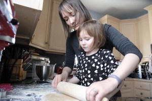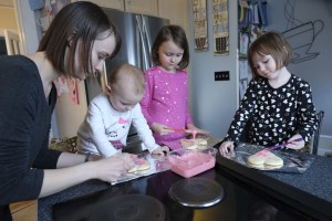 The next day it was time to bake the sugar cookies. Katie, Sophia, and Elizabeth all took turns using the rolling pin to roll out the cookie dough. Elizabeth didn’t want Sophia to take a turn after she went. Everyone had fun helping me roll the cookie dough and use the cookie cutters. Someone may have tried (and succeeded) to eat some cookie dough.