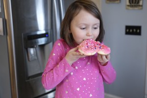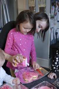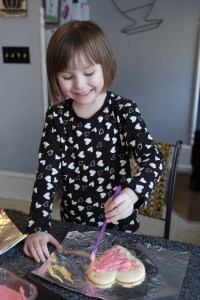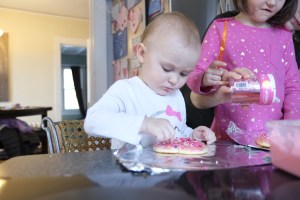 Later that afternoon, my girls got to decorate their own big heart sugar cookie. I brought out the frosting and they each had their own butter knife to spread the frosting on their cookie all by themselves. They enjoyed licking the frosting a little bit as they were adding the frosting. Then they got to add a variety of sprinkles on top of their cookies. And the best part at the end – they got to eat their cookies – most of it. They’re saving the rest for later.