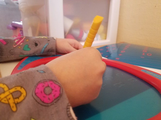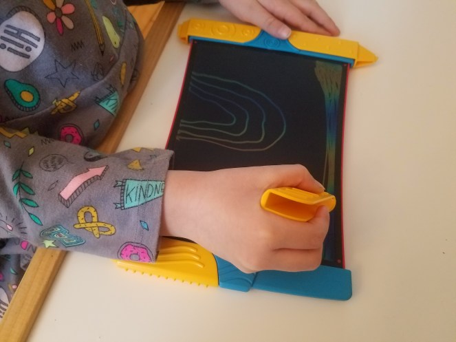 So of course before bed the other night, Elizabeth had to take her turn on the Scribble n’ Play Boogie Board. She insisted to sit on top of their play table instead of seating on the chair. She enjoys using each stylus and scribbling and seeing the rainbow lines appear on the screen. One of Elizabeth’s favorite things to do is color. By the way, don’t you love her Anna and Elsa pajamas?